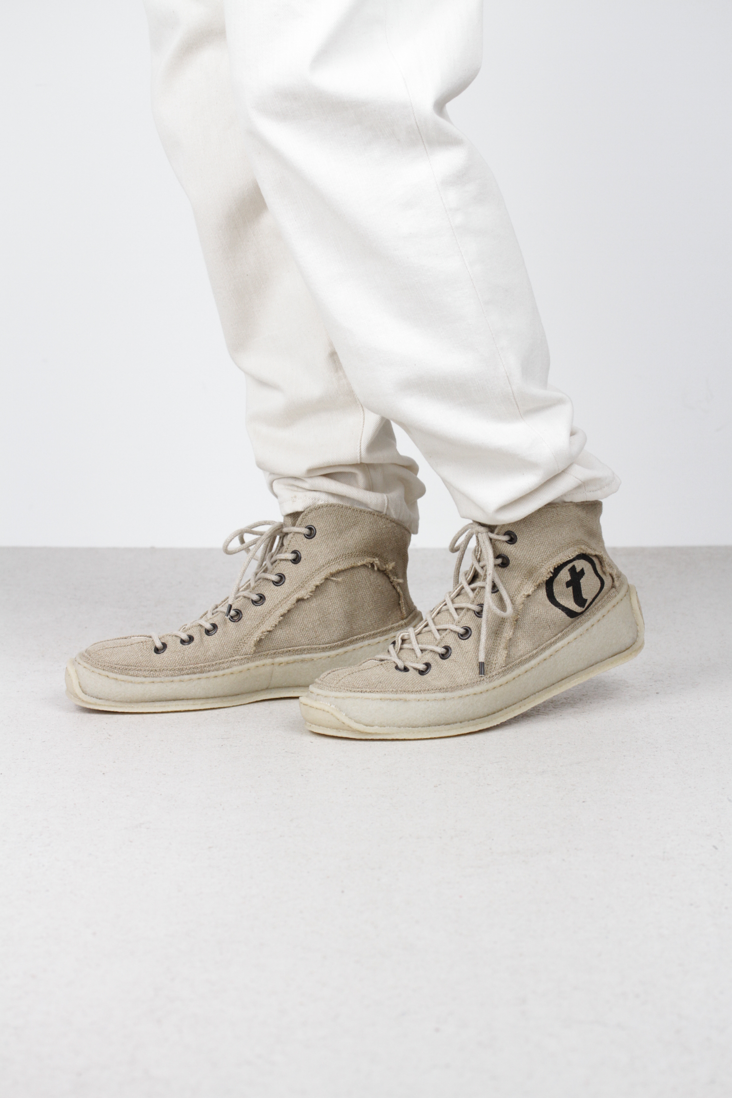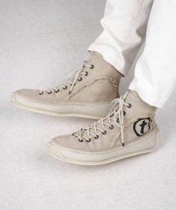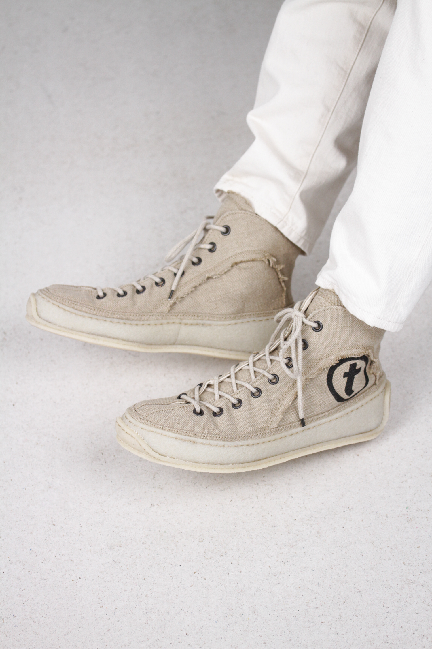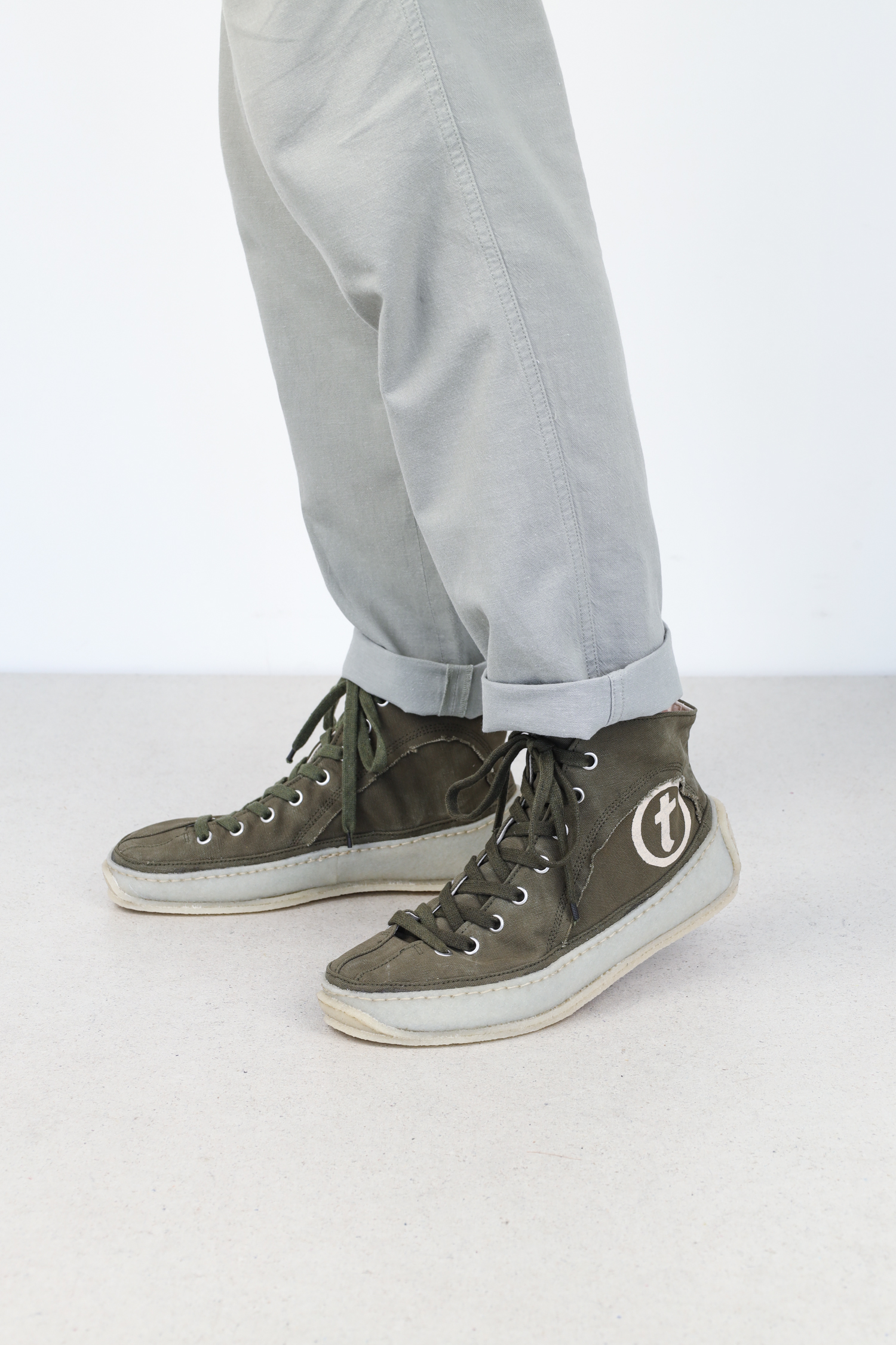 The three-layer natural rubber sole is double stitched. The upper is made from old Belgian linen mailbags, military tarpaulins or post-consumer jeans.