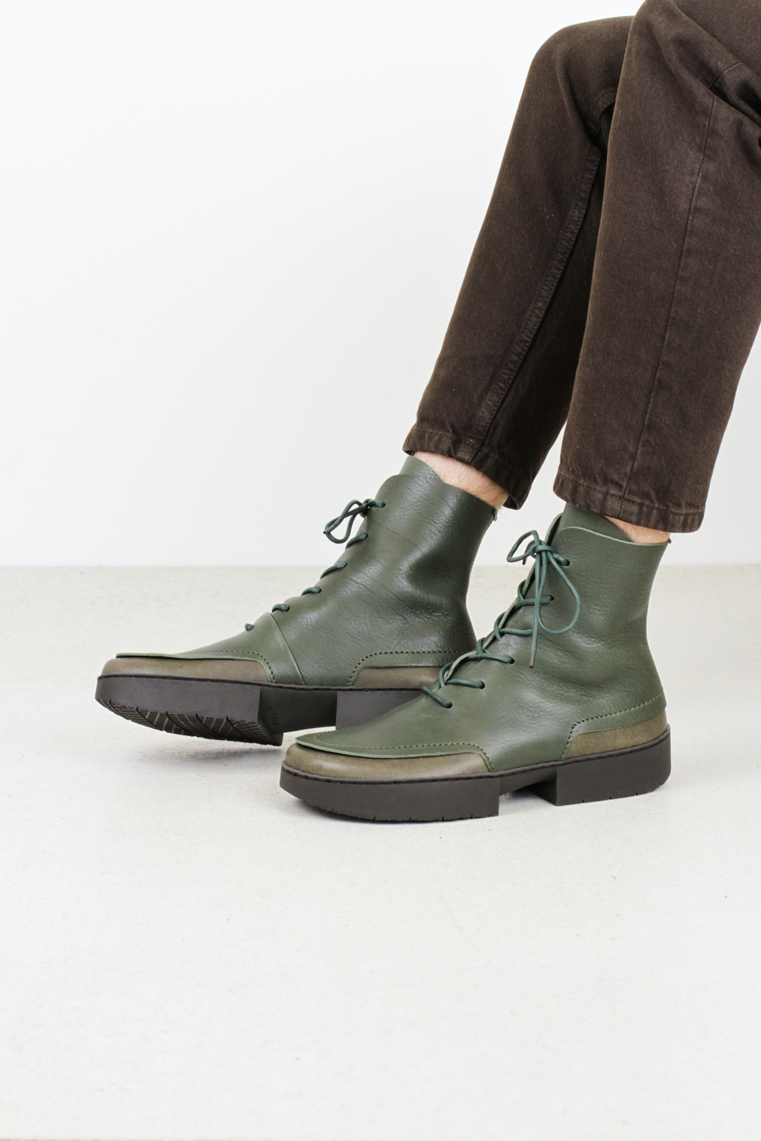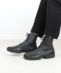 Unisex lace-up boot with interleaved design and top-stitching, framing the interplay of the outer layer.