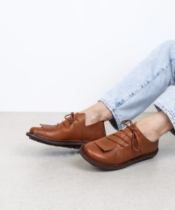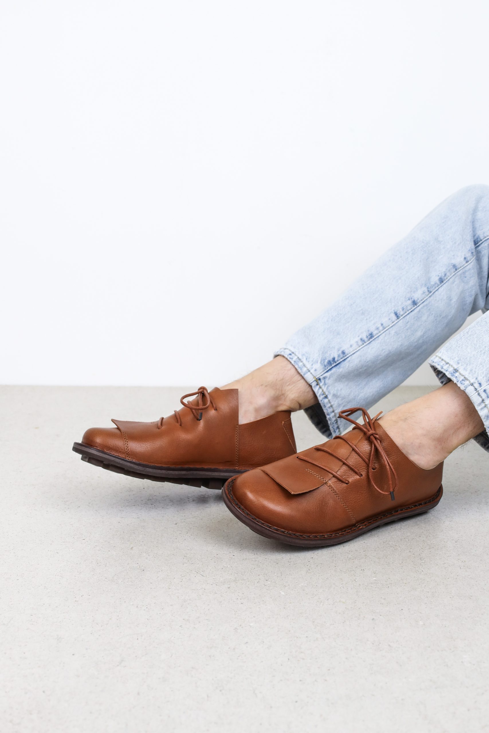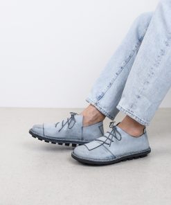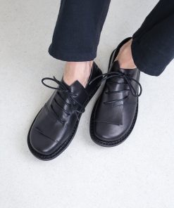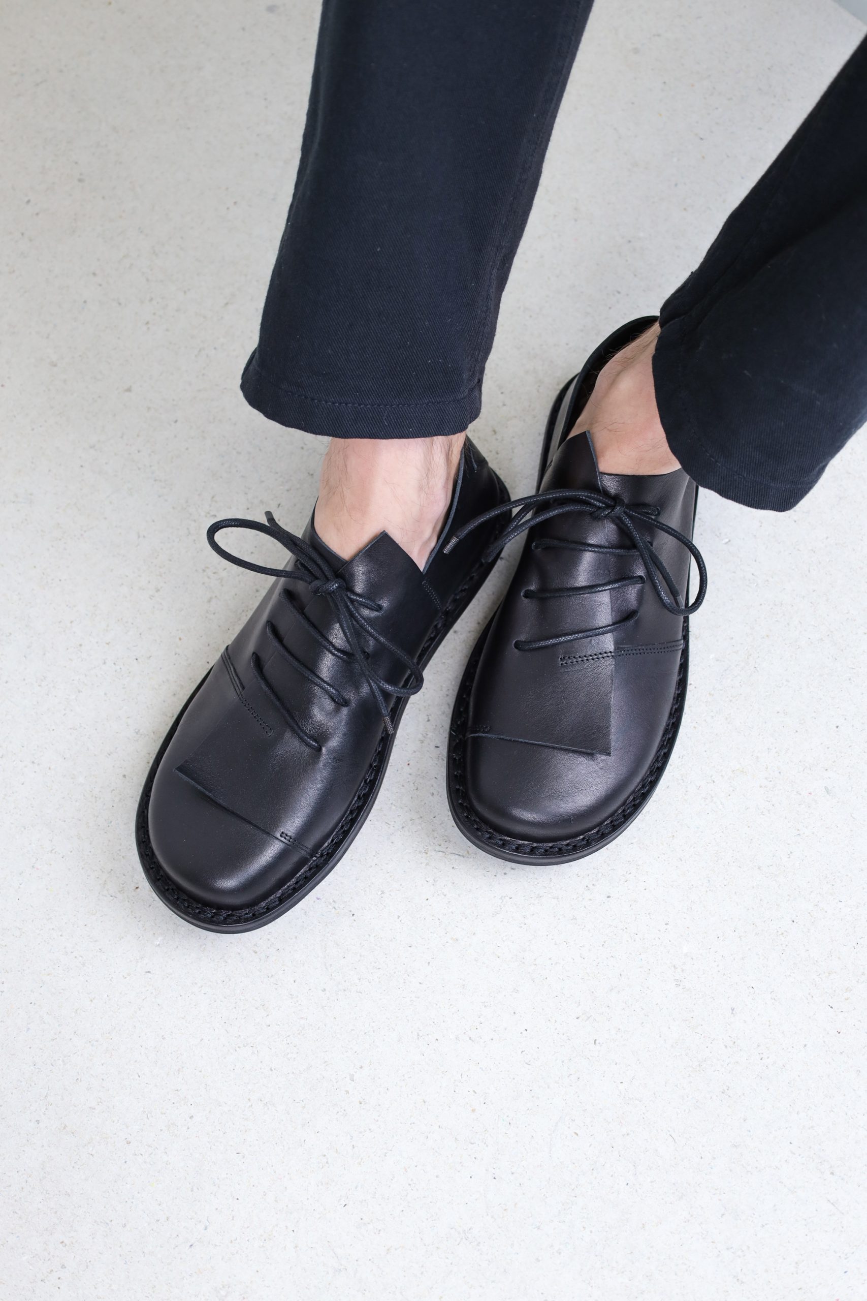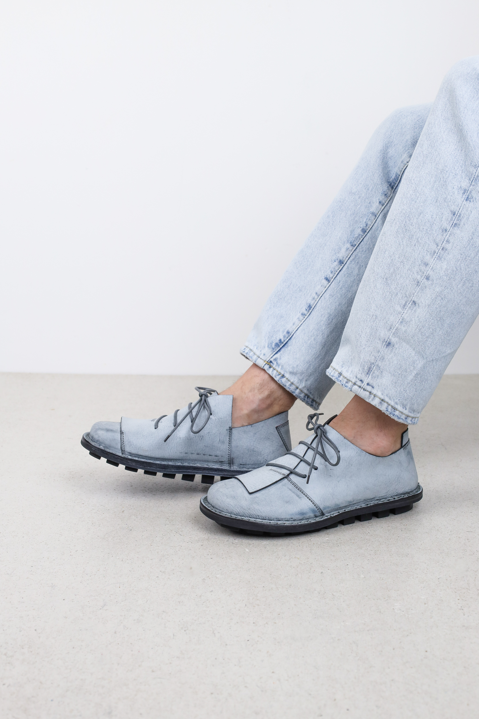 The deconstructed sections of this low shoe are held together by a fanned-out lacing.