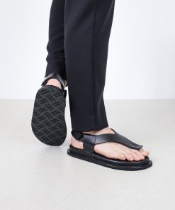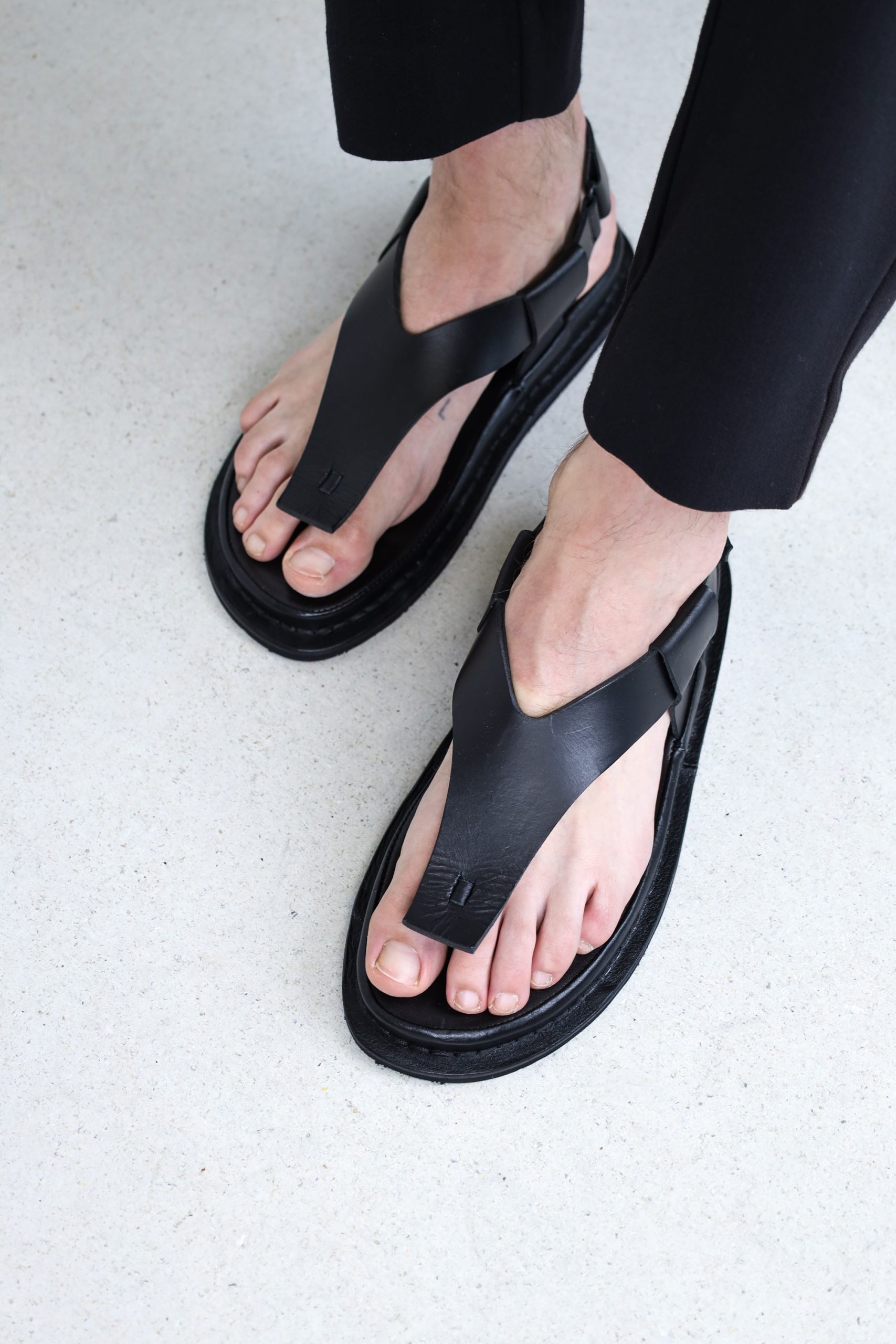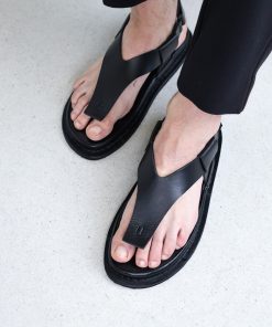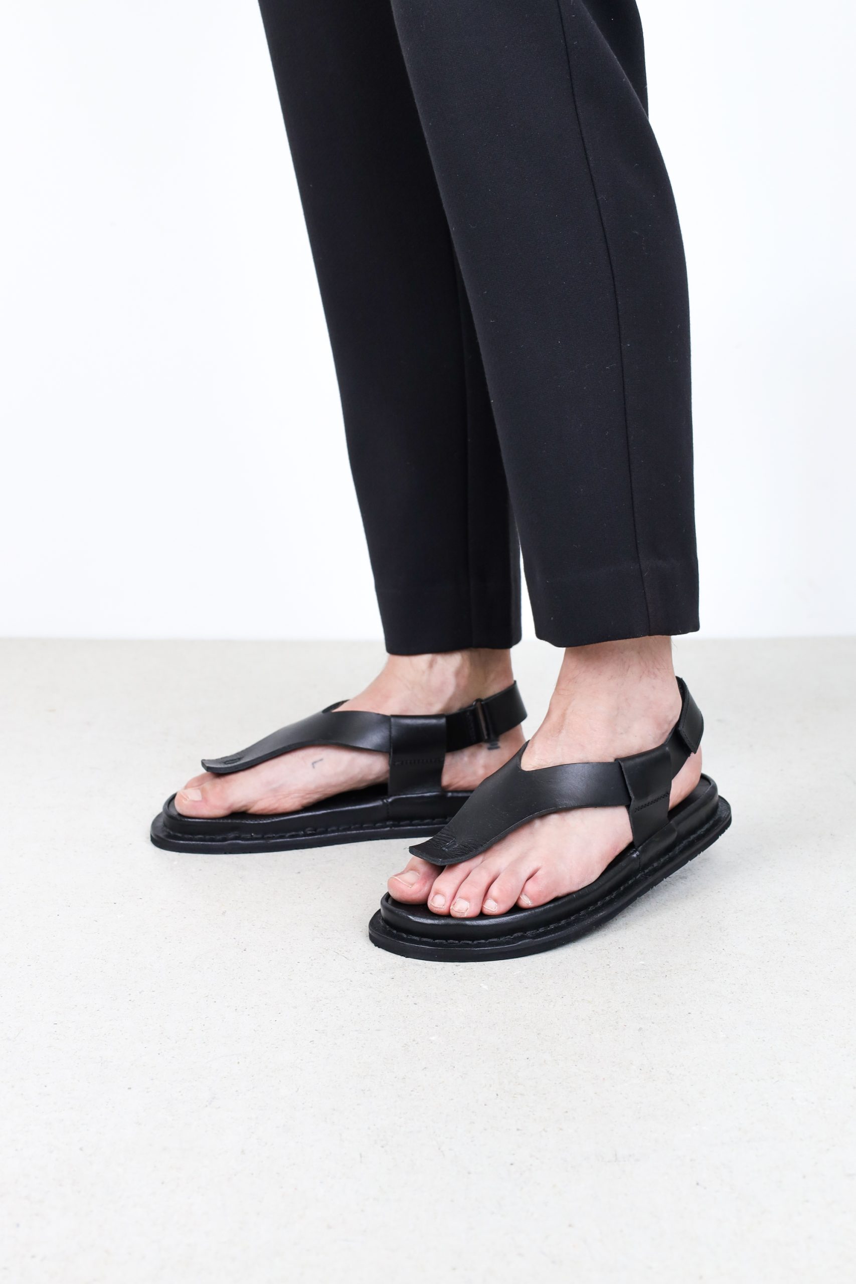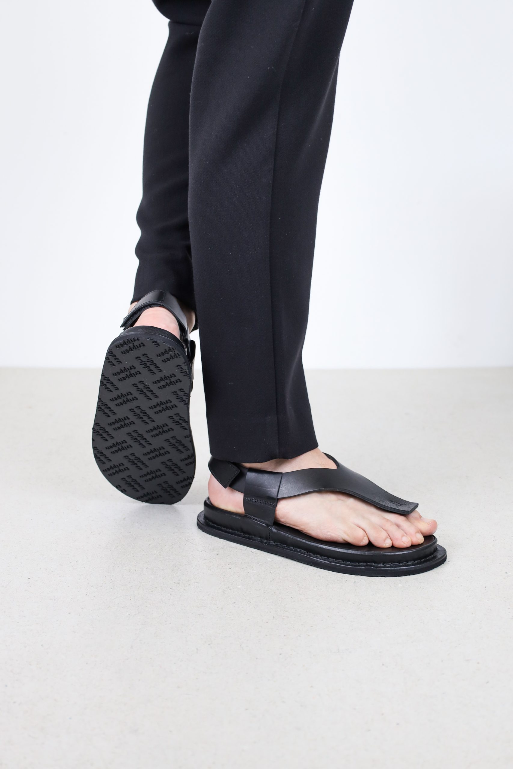 Starting with a minimalist design on a small toe bridge, an elegant split strap wraps around the foot and is held in place with a Velcro fastening.