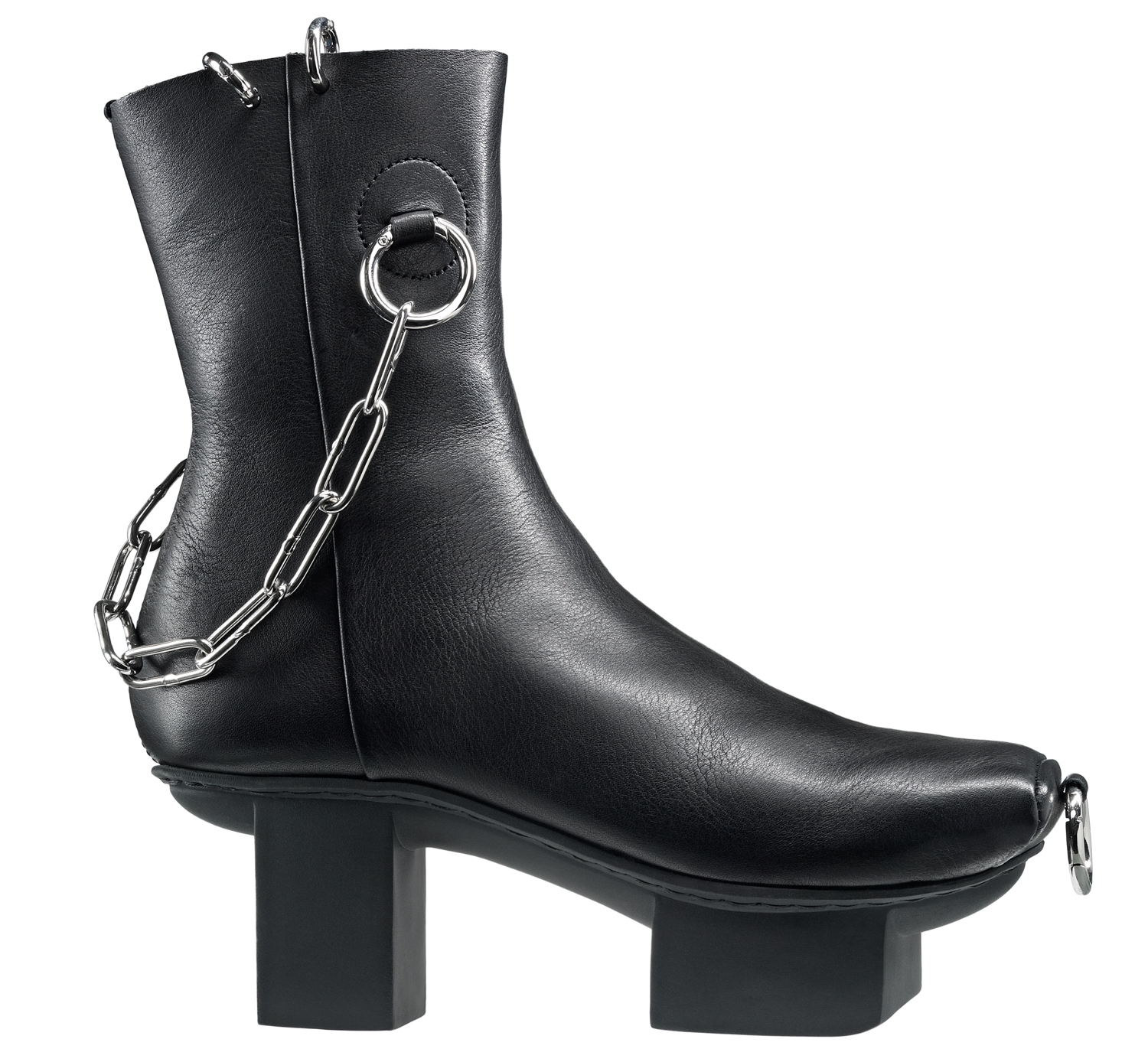 Fecal Matter in collaboration with Trippen created ankle boots that are decorated with piercings which can be found on the square tip of the shoes as well as on the top. Around the ankle, Fecal Matter added their signature chain element.