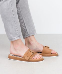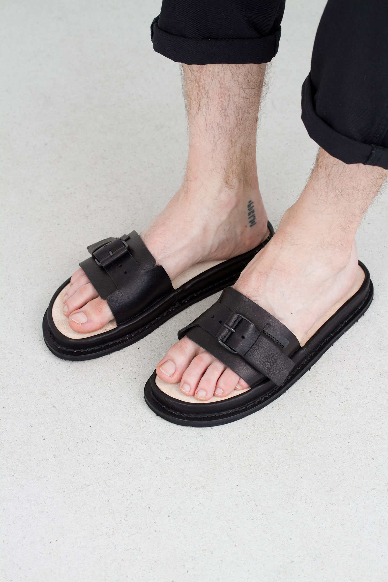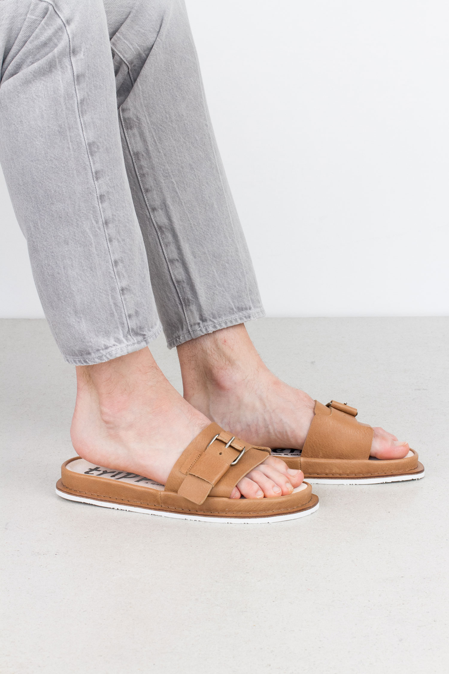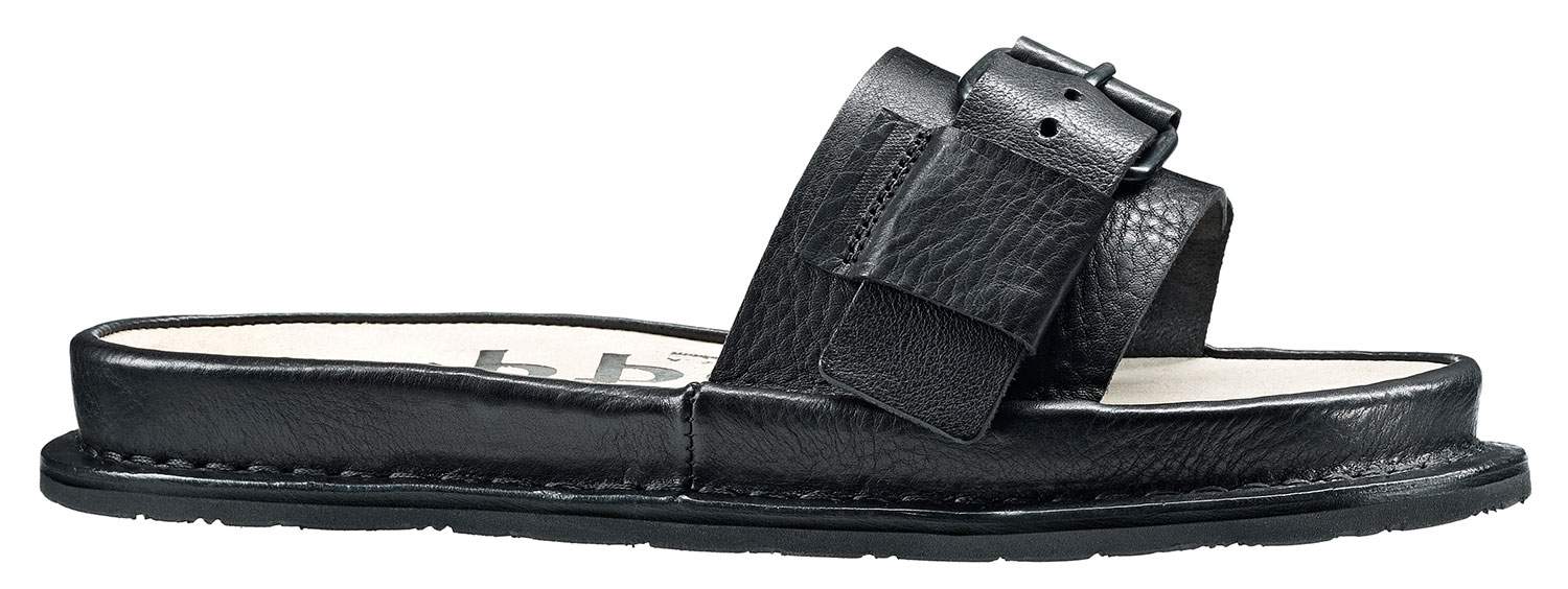 Slip-on shoe with Zori sole and a light suede insole. The leather-covered buckle on the upper can be adjusted individually to the foot of the wearer.