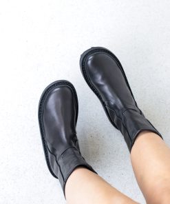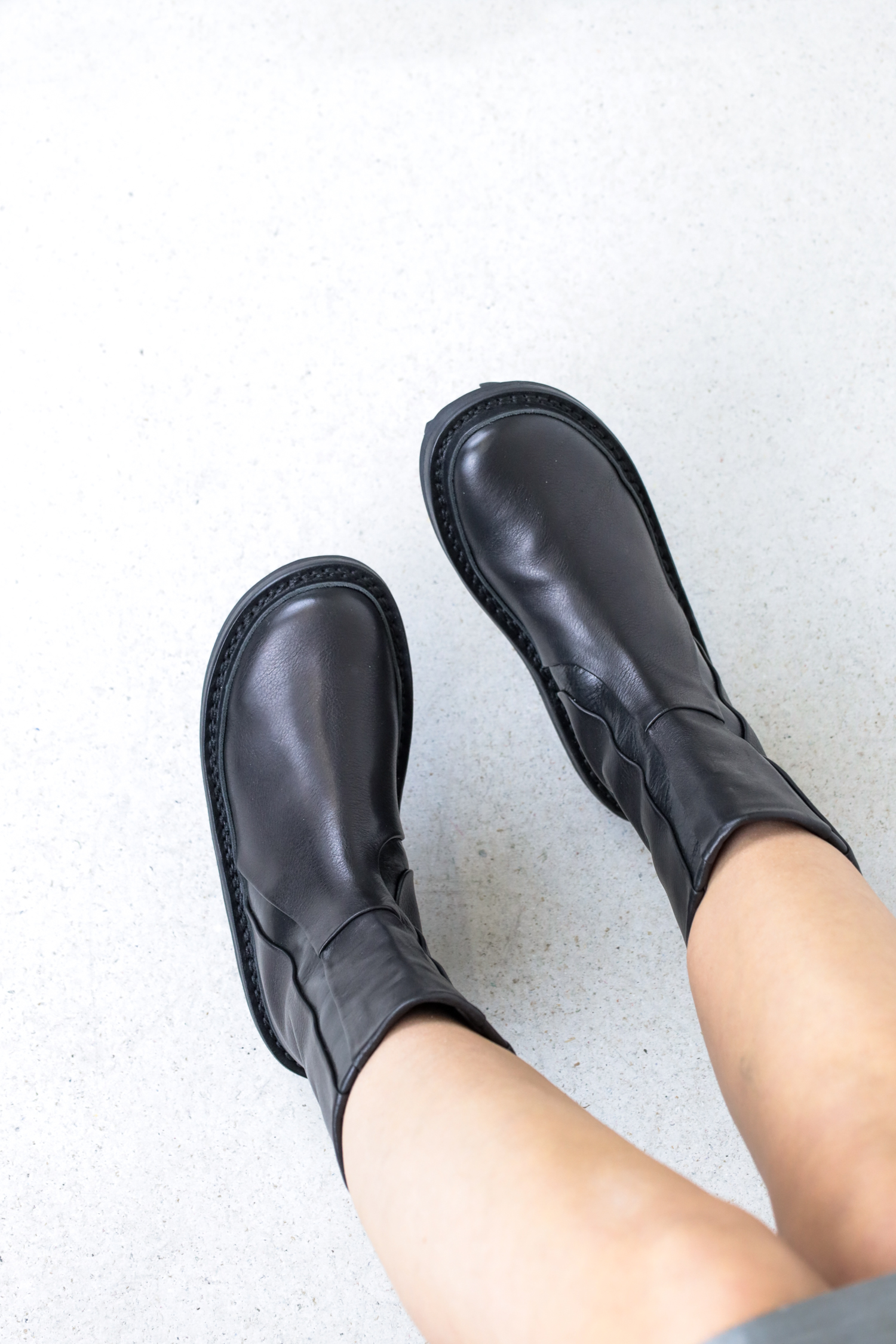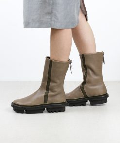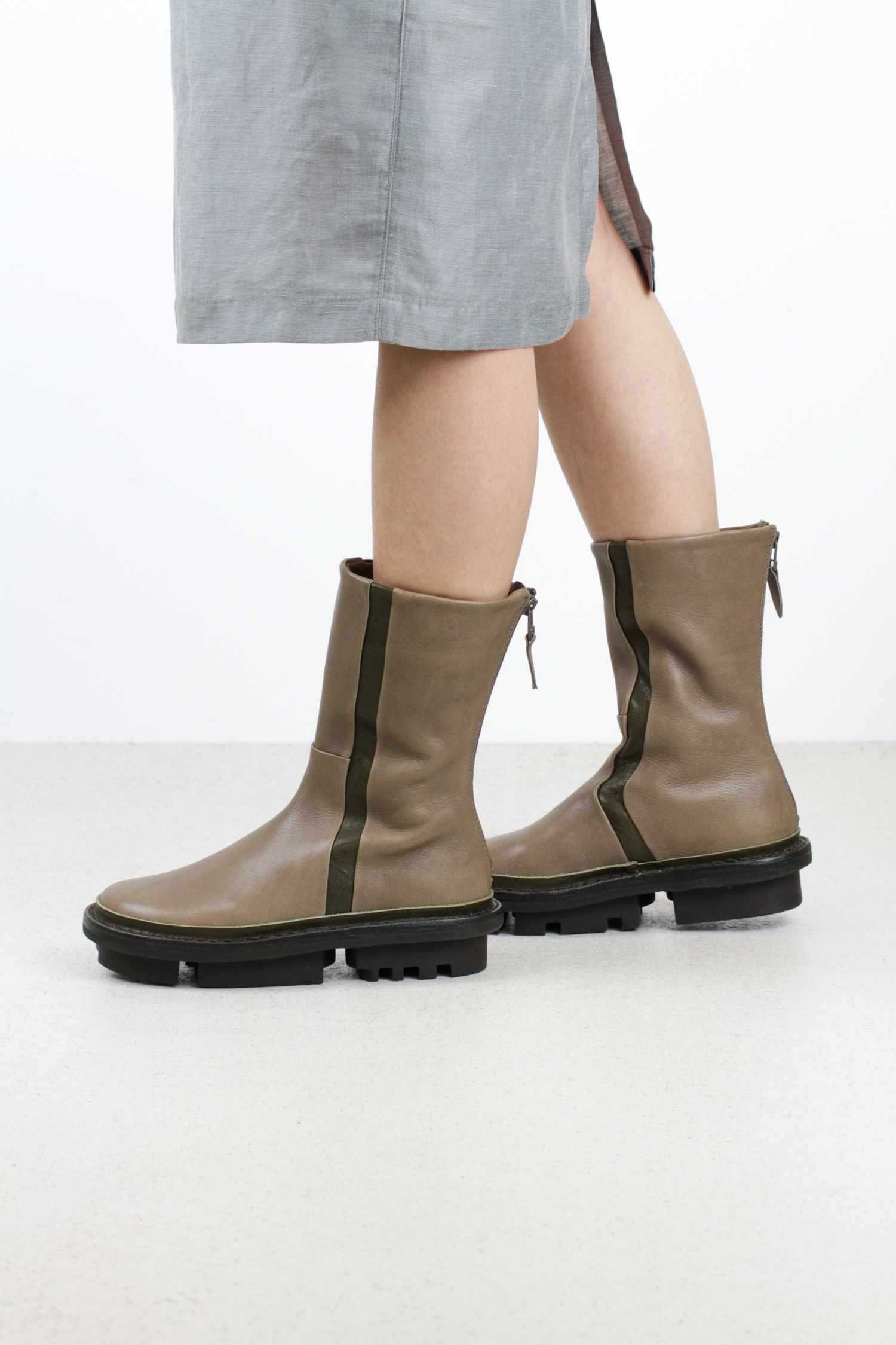 This minimalist unisex boot features asymmetric, vertical contrast lines up the sides, and is finished with a back zipper closure. The option of adding a warm fur lining is also possible for this style.