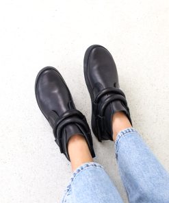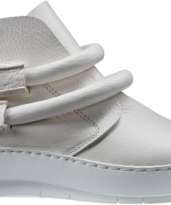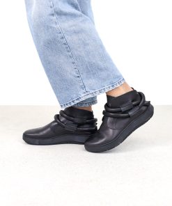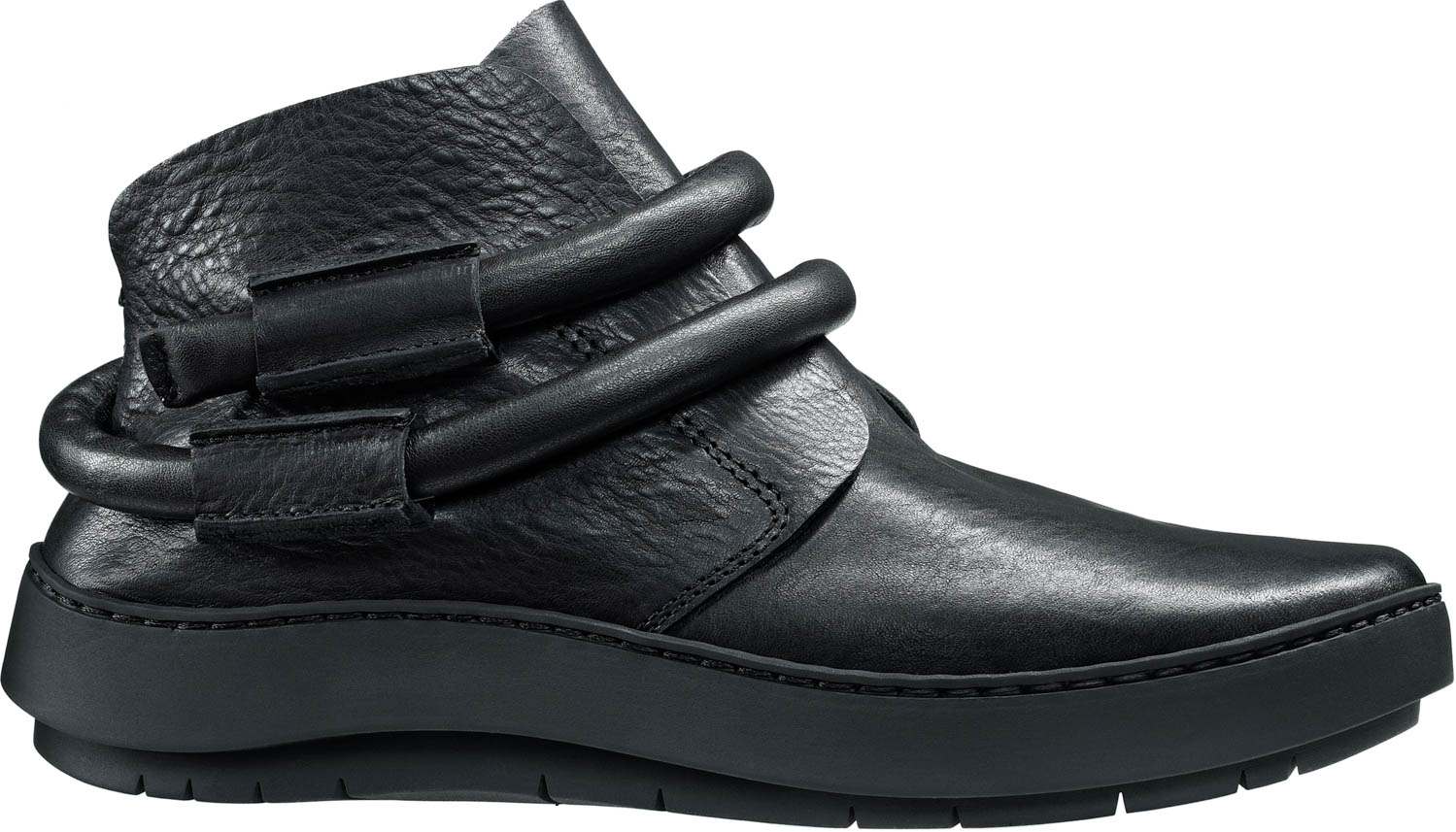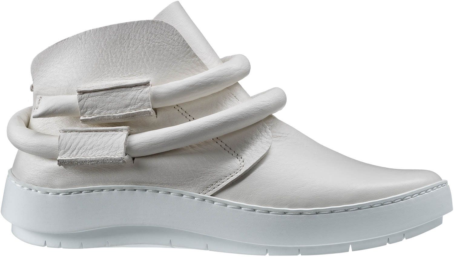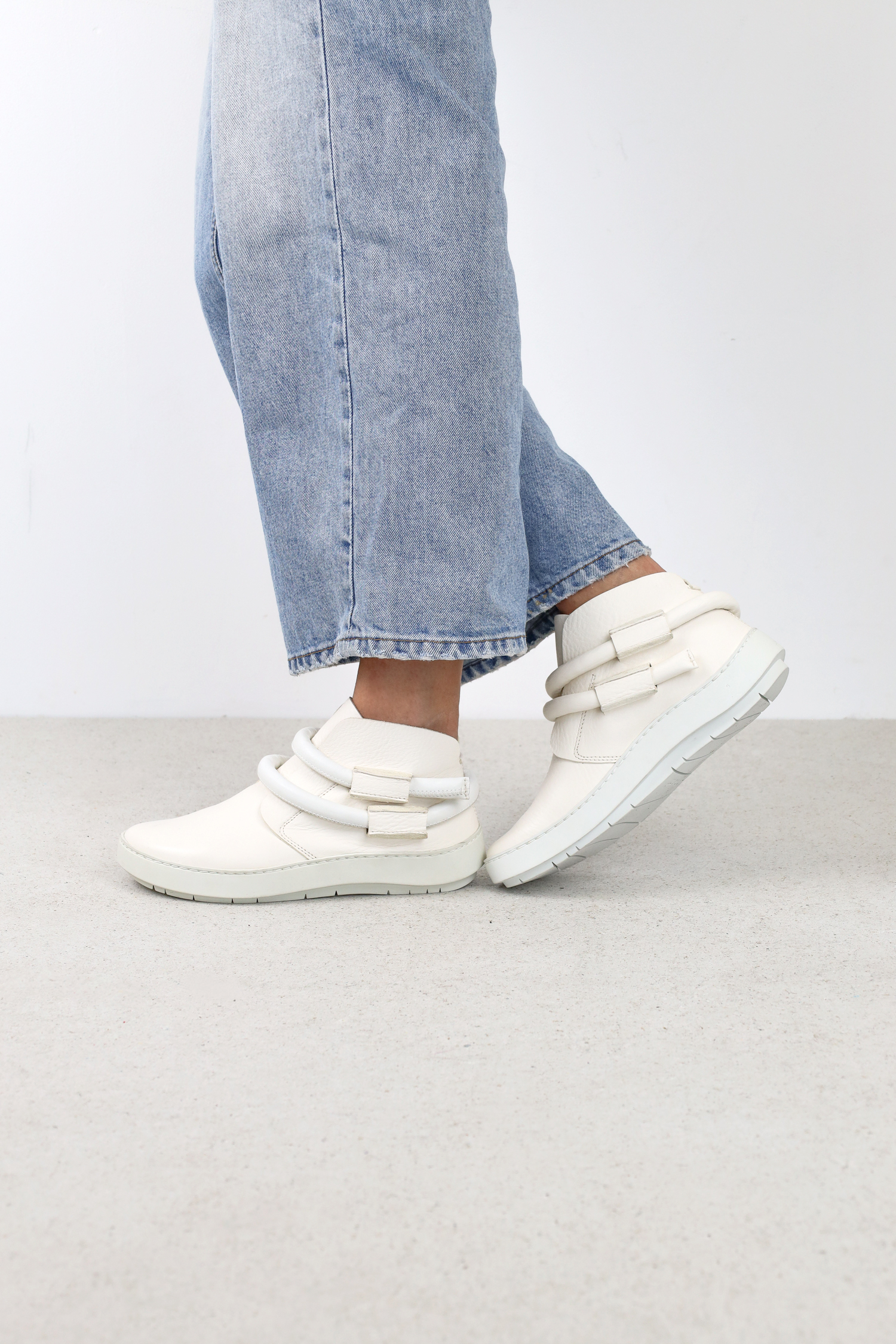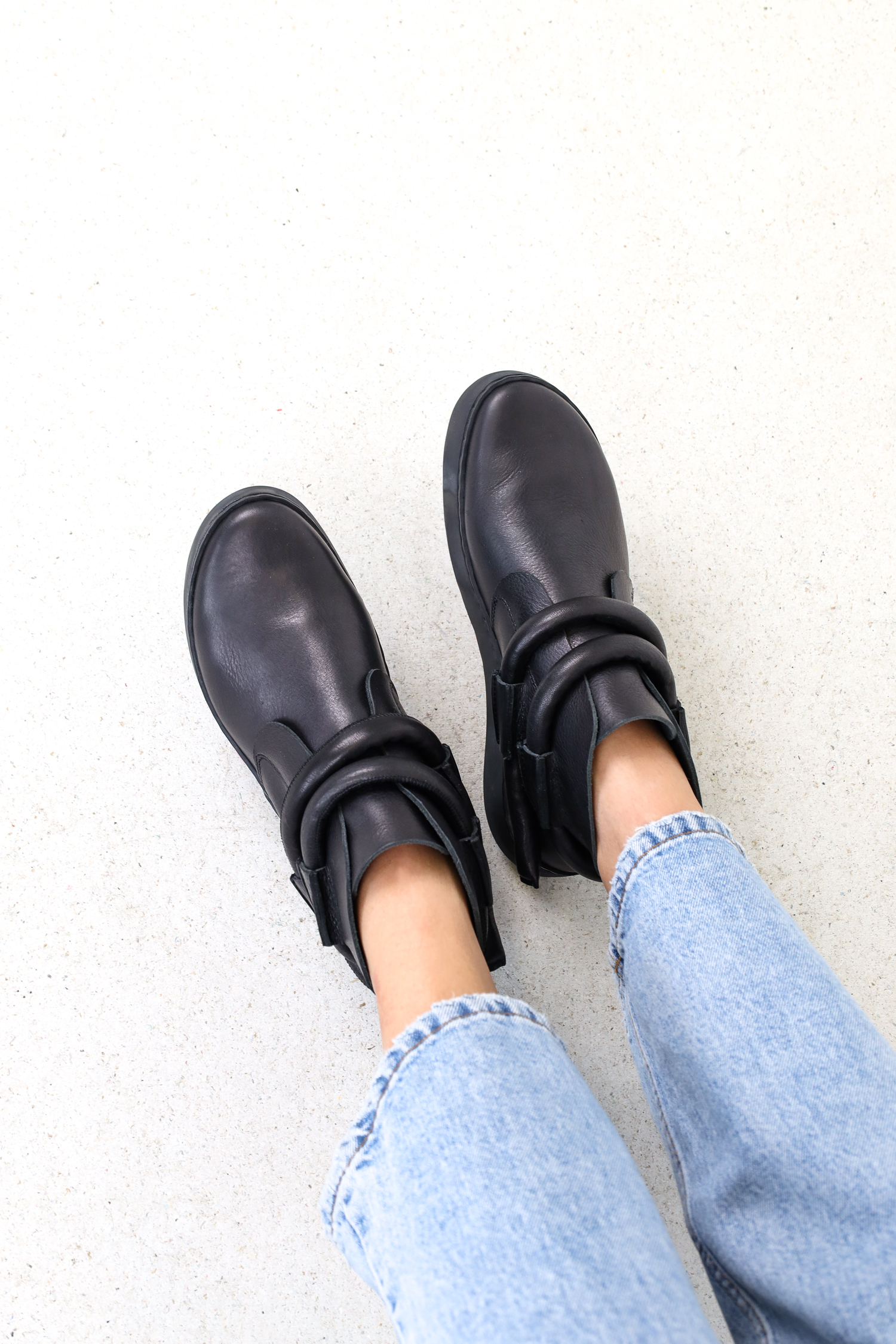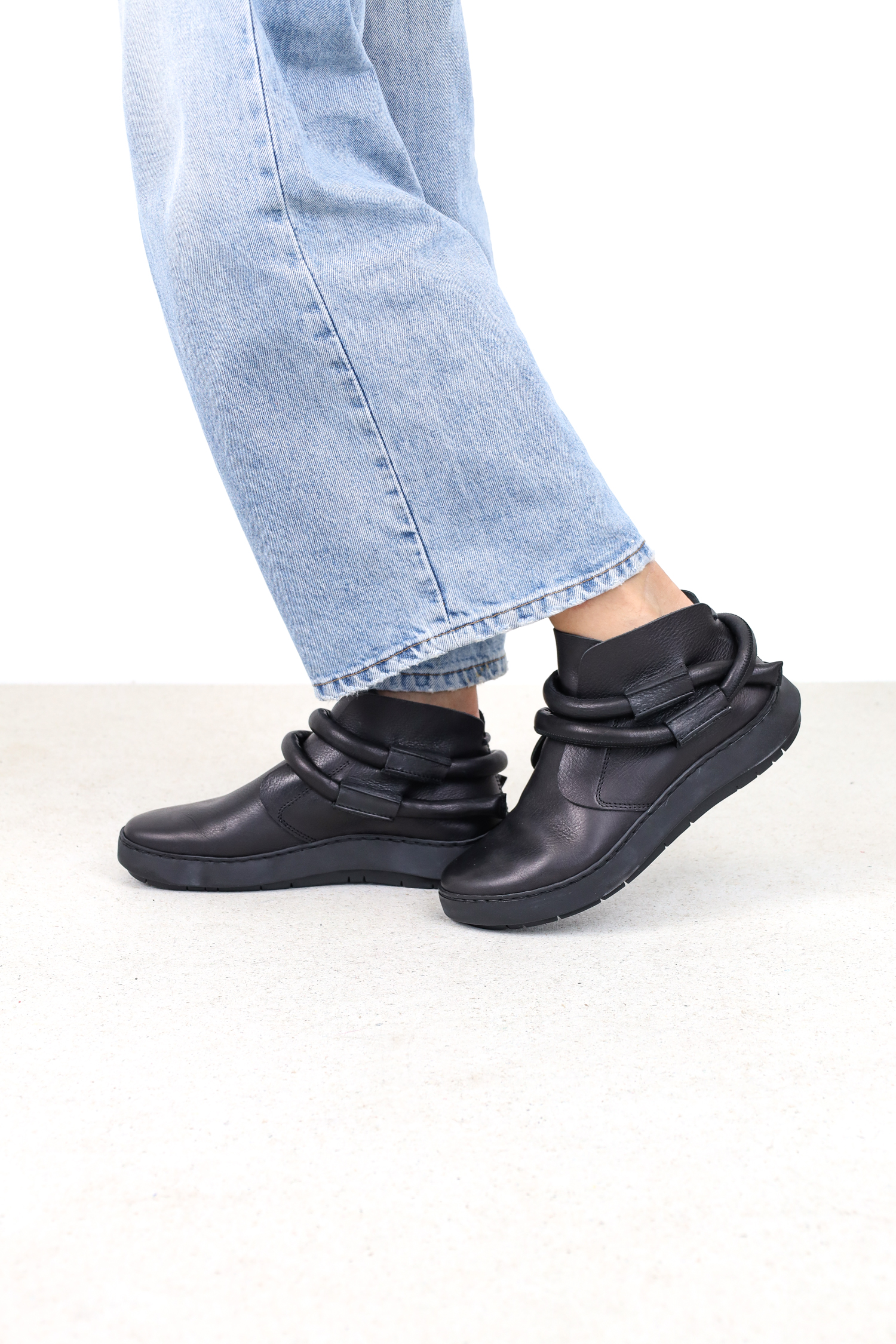 Slip-on booties with hidden elastic on the instep. The thick leather cord is loosely wound around the ankles.