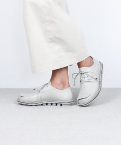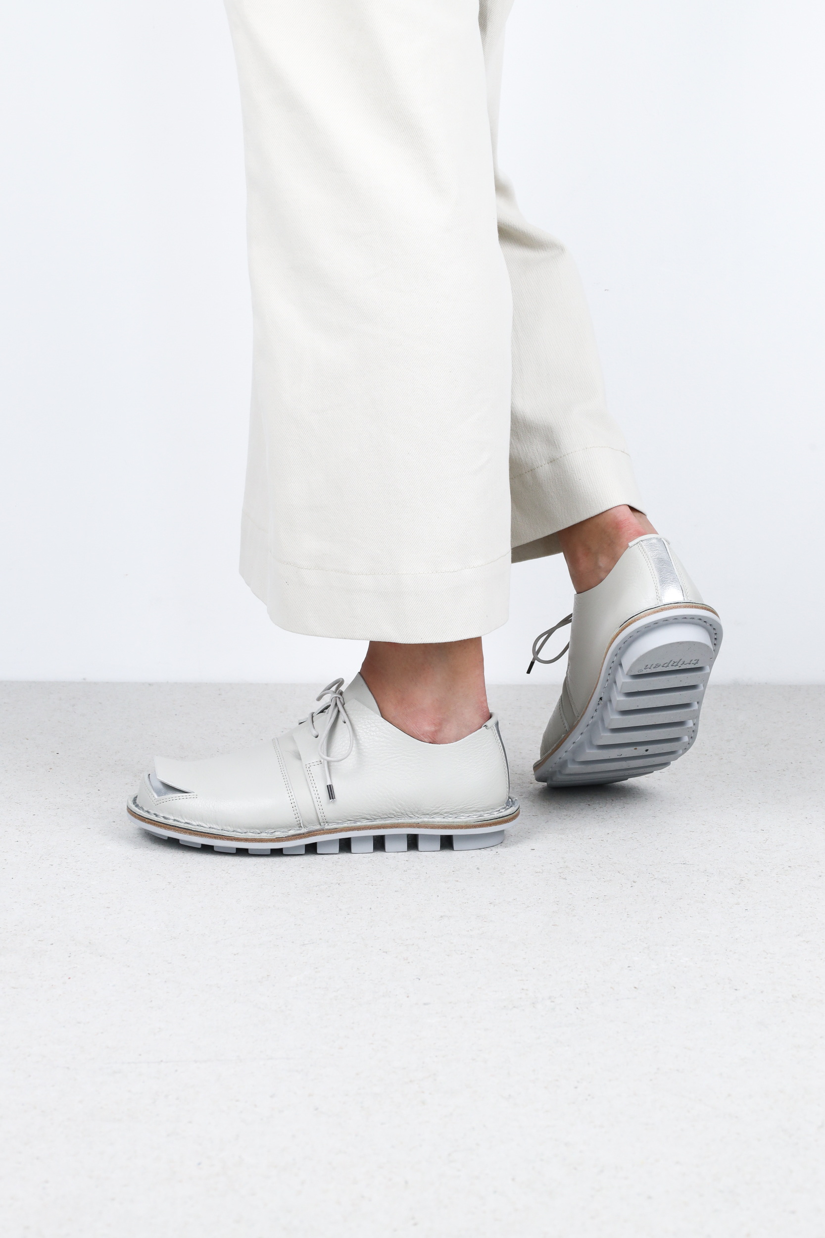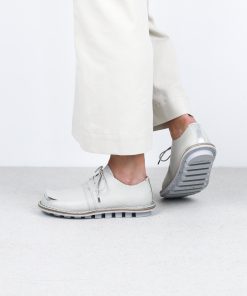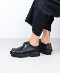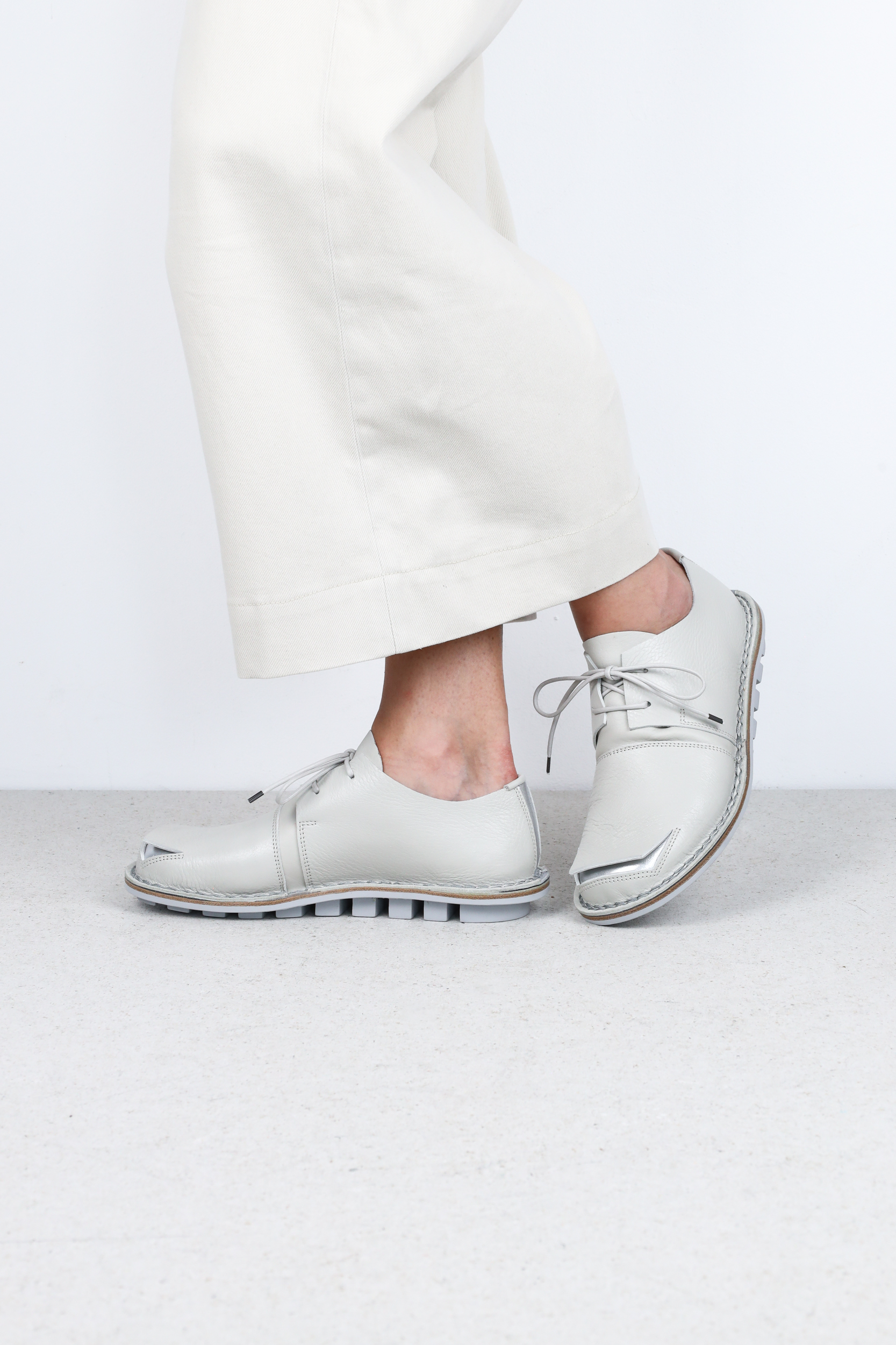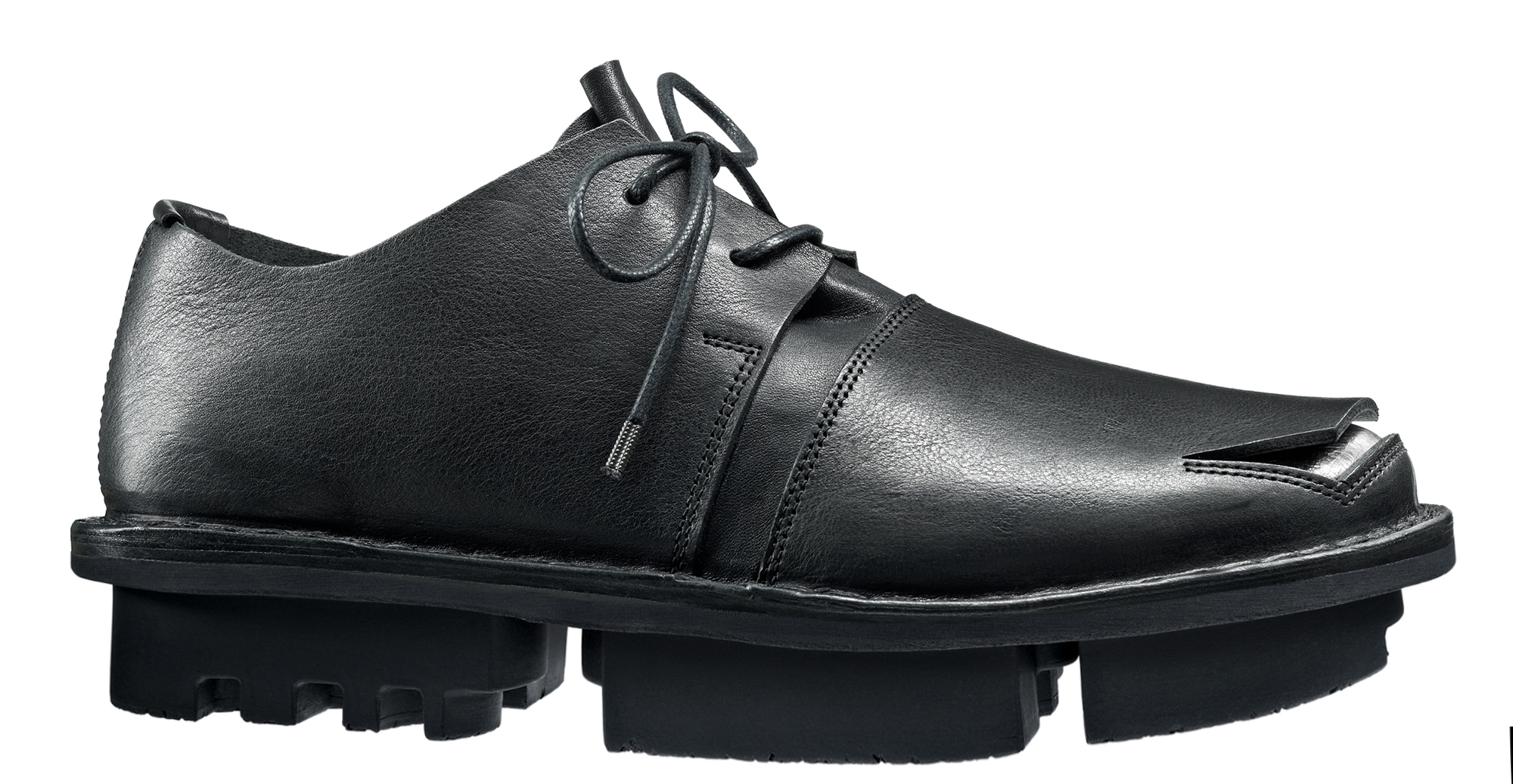 A square peels away from the toe, revealing the layer of this modern lace-up shoe underneath.