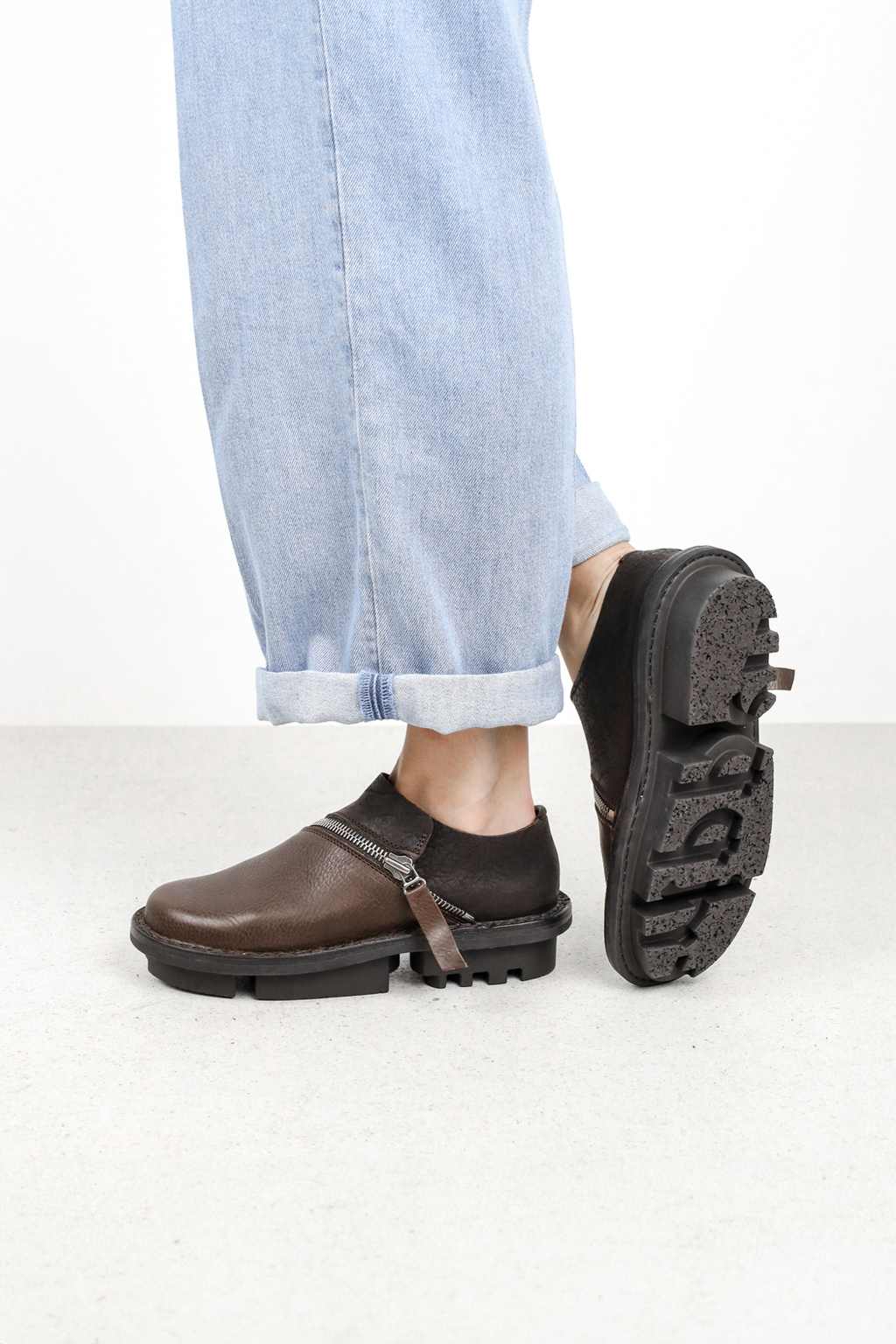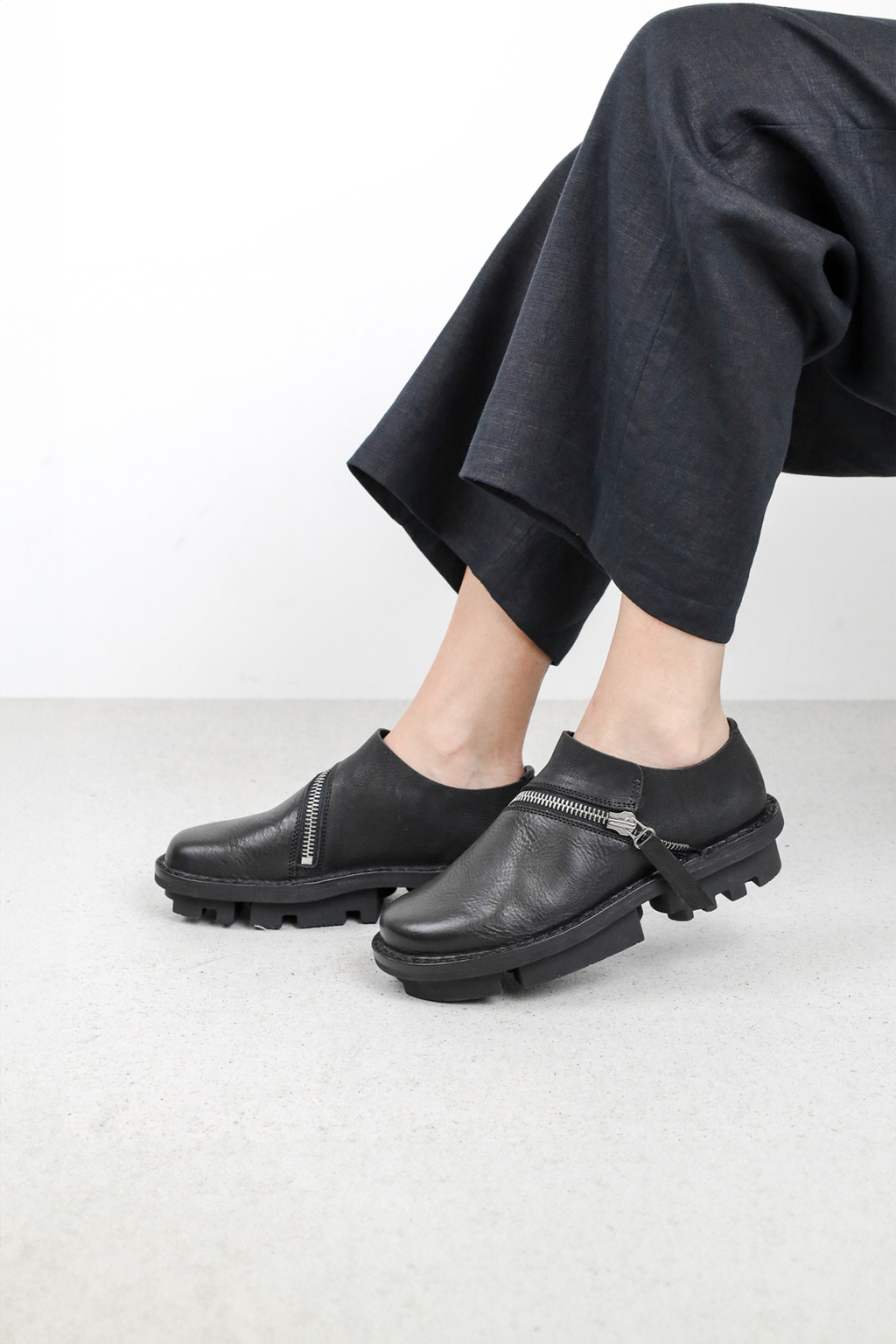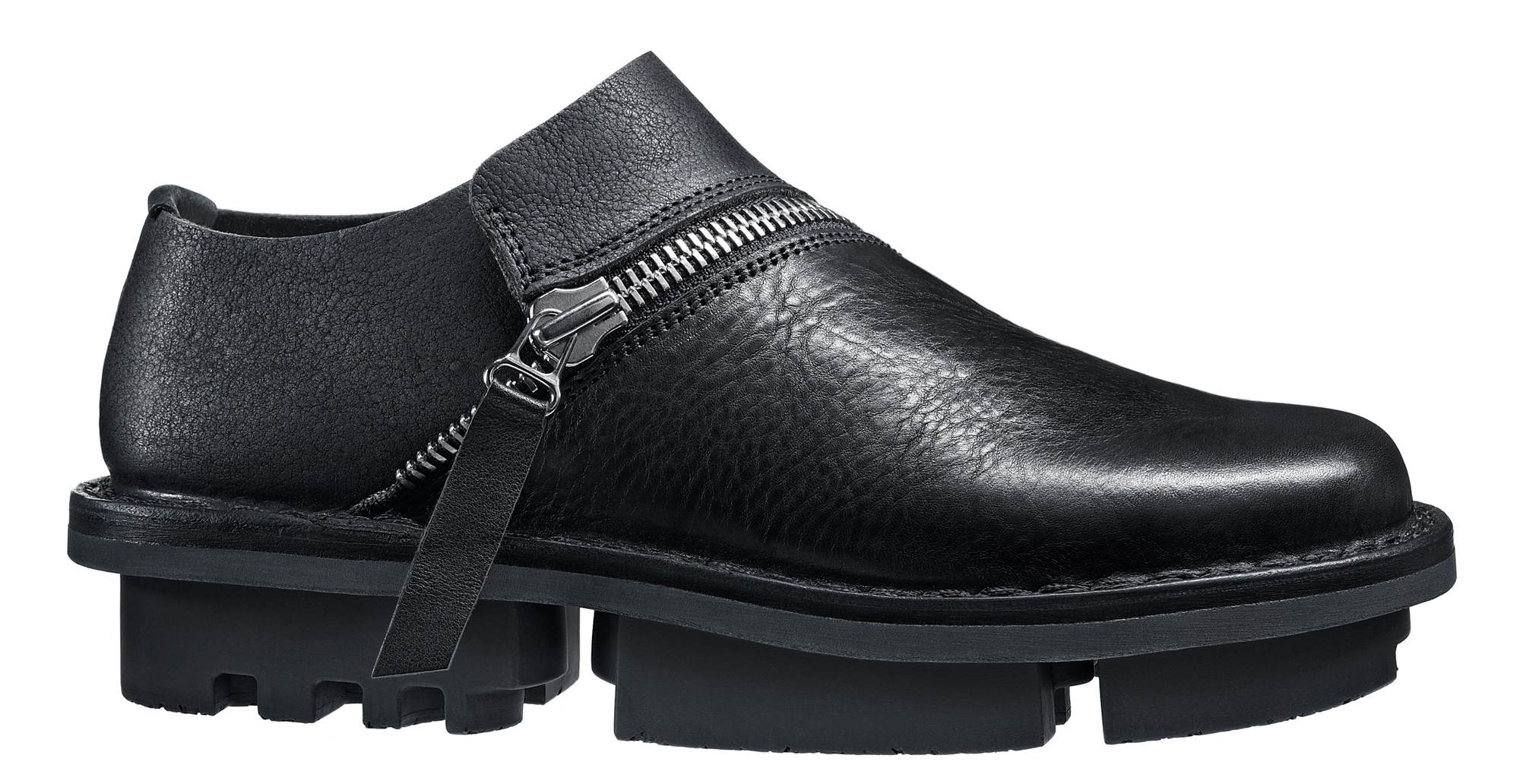 The wide metal zipper running diagonally across the instep divides the shoe into two halves, which can also be accentuated with different materials or colors.