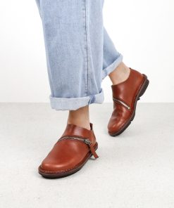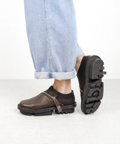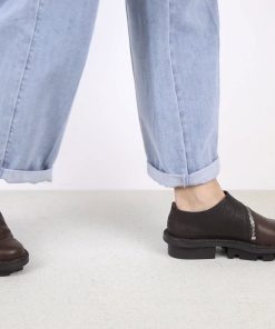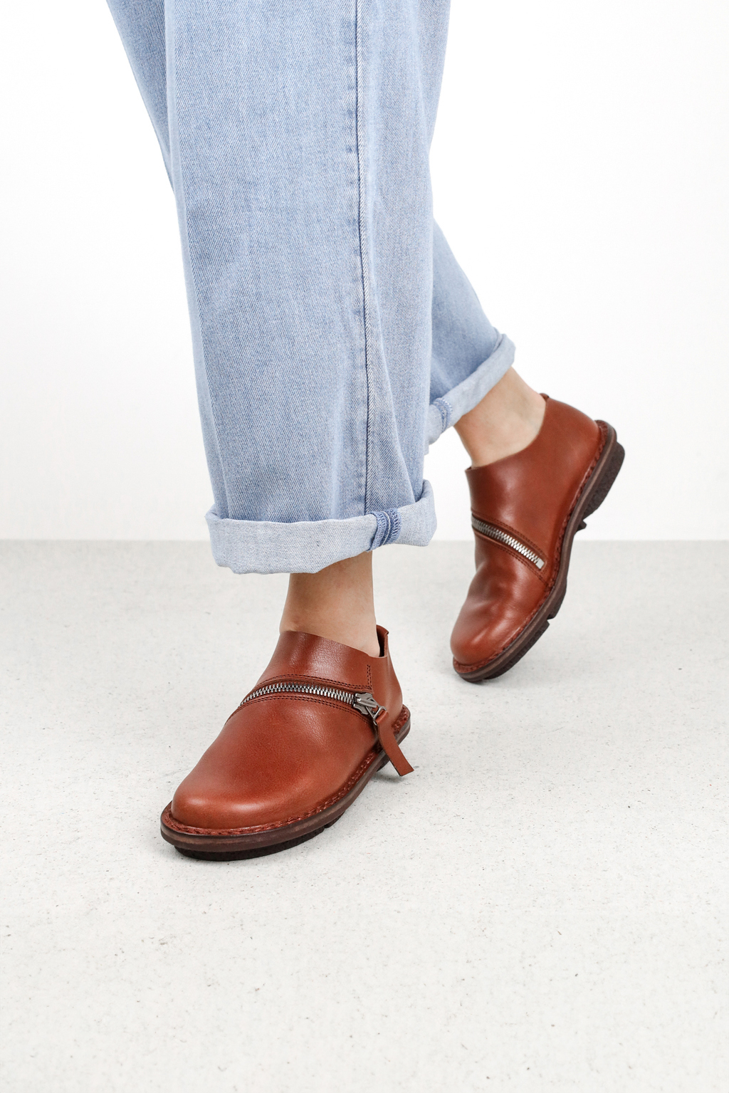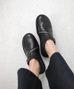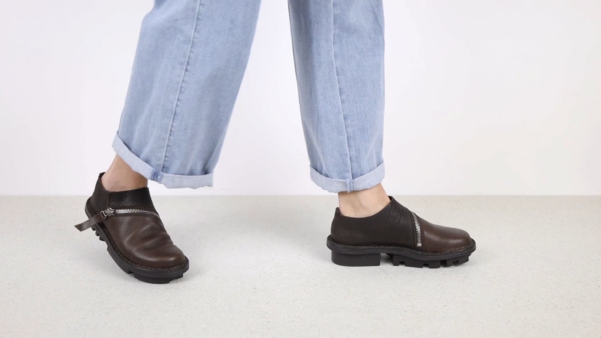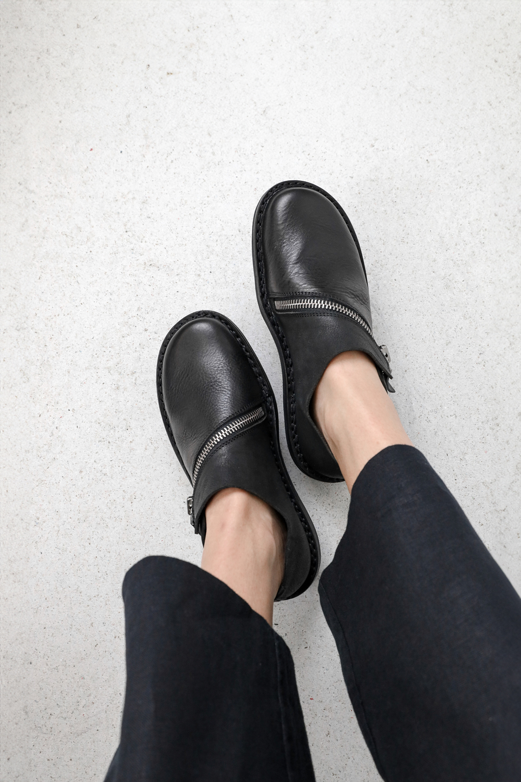 The wide metal zipper running diagonally across the instep divides the shoe into two halves, which can also be accentuated with different materials or colors.