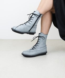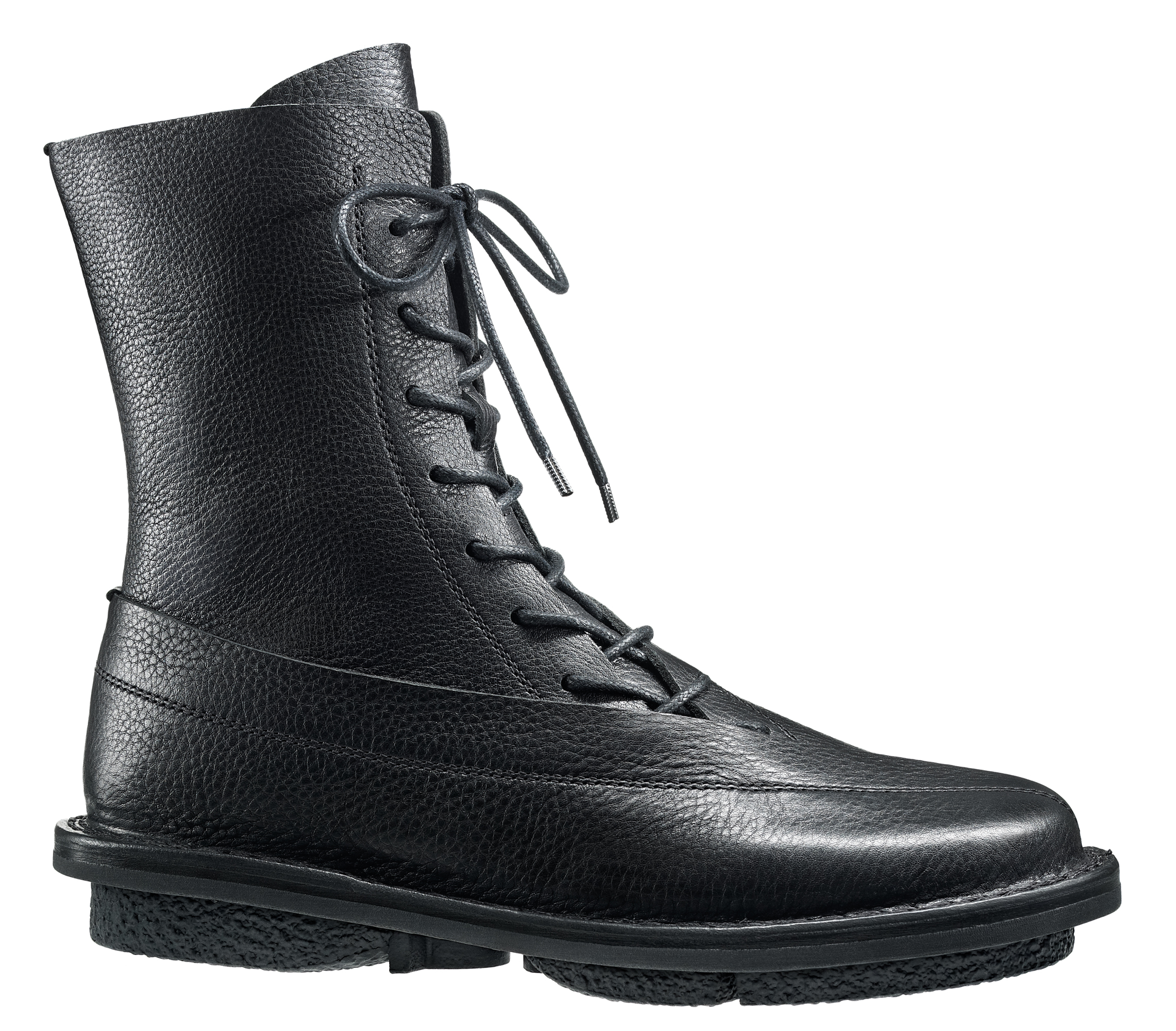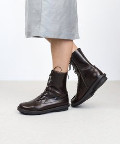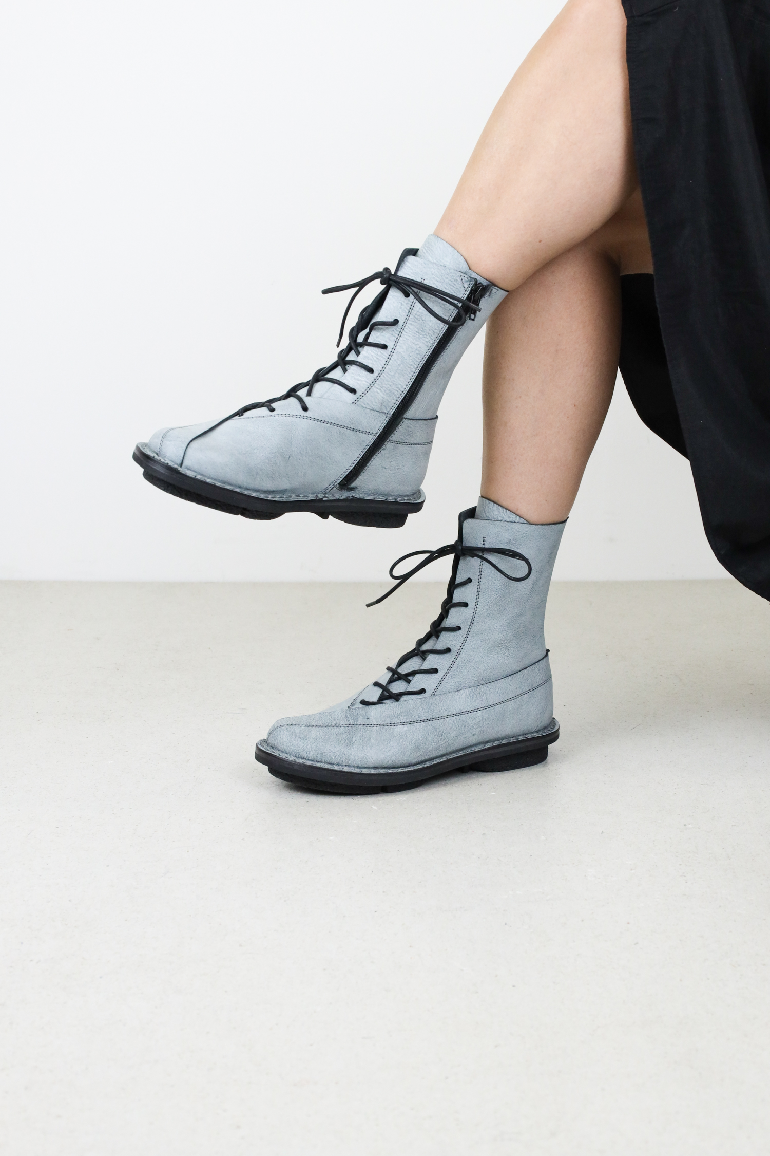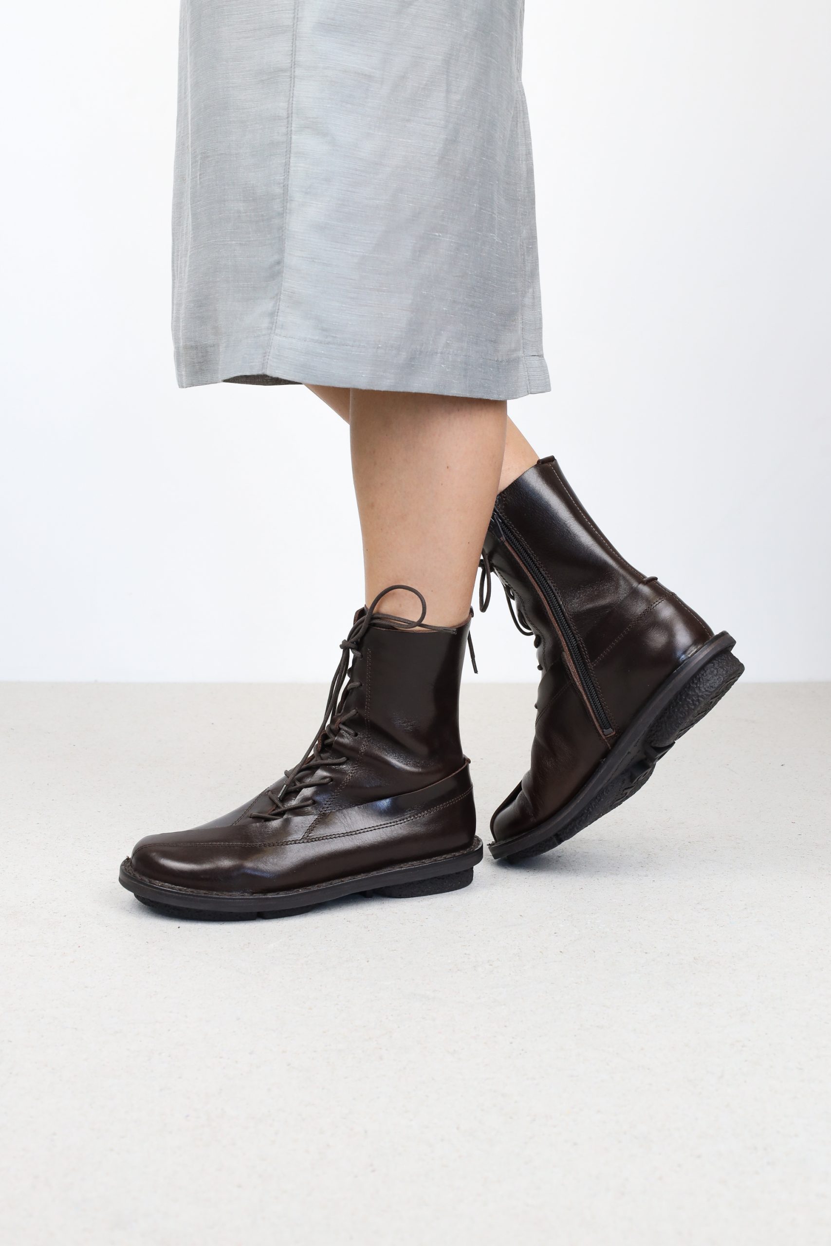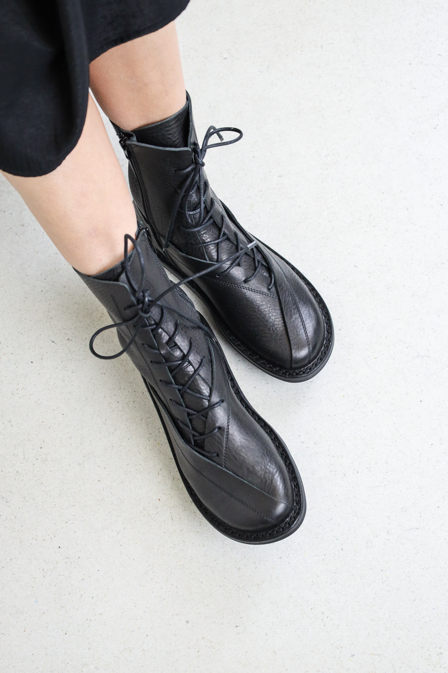 The lacing on this boot disappears asymmetrically into an overlap running from the toe over the instep and around the heel to the zip on the inside.