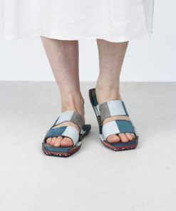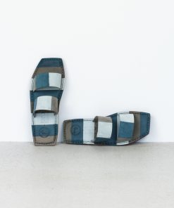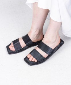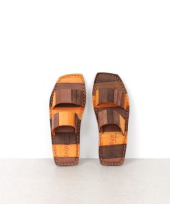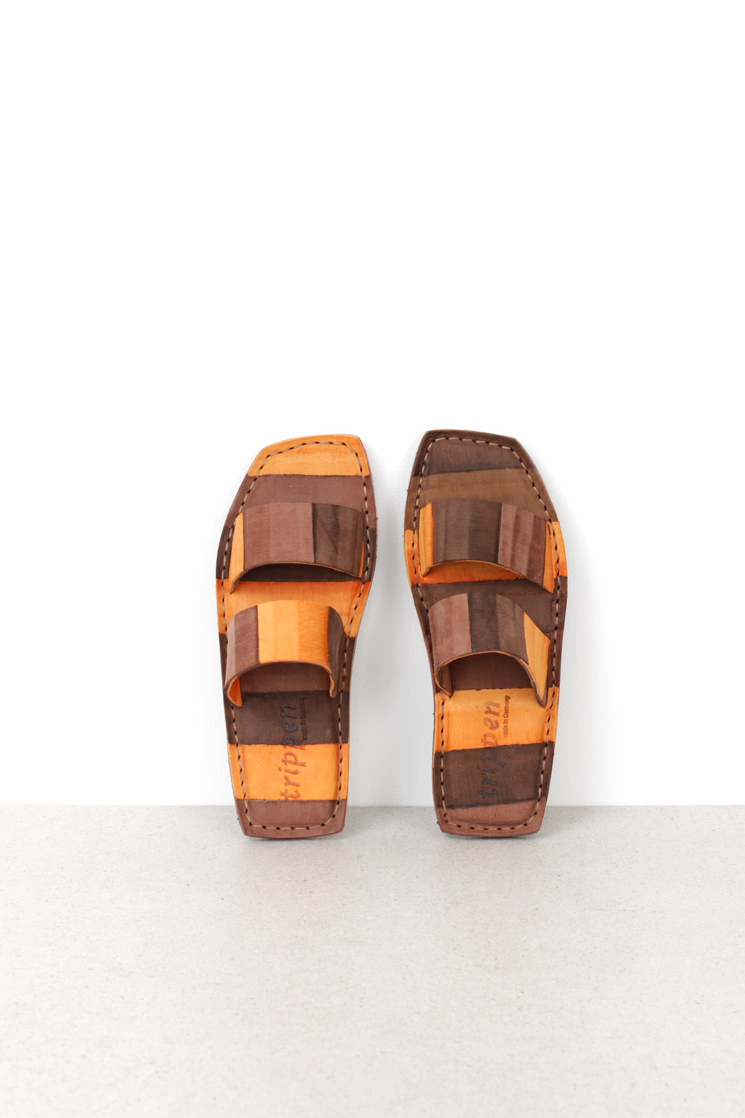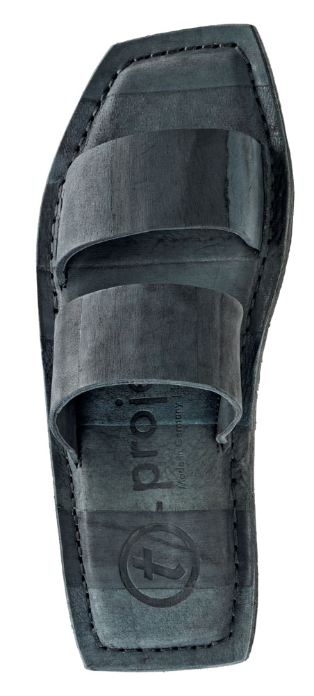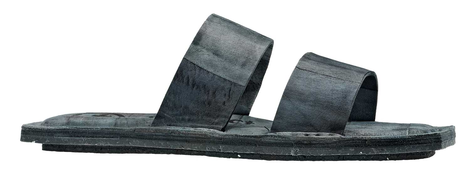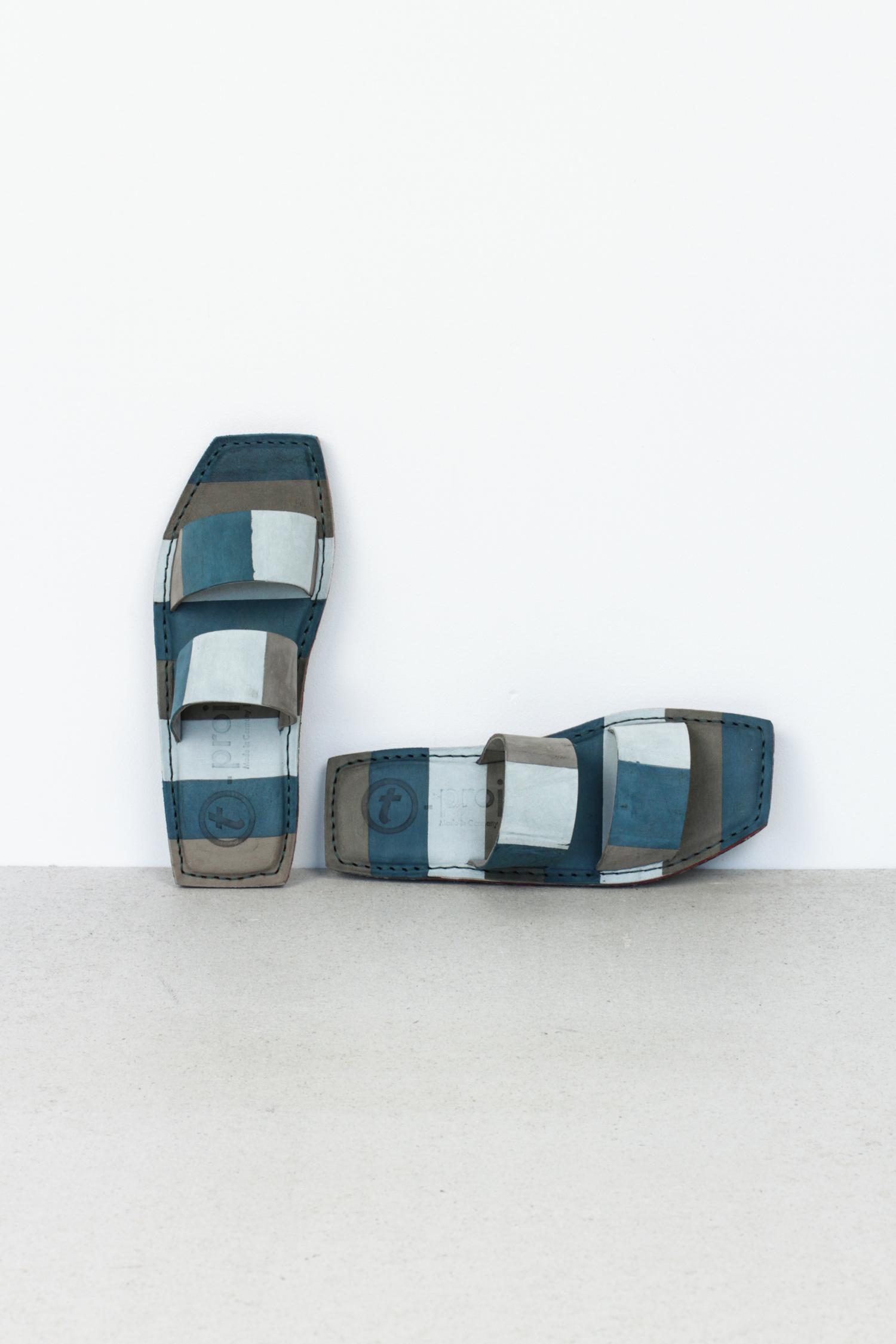 Distinctive square-toed sandal featuring an upper and midsole made from leather punching scraps, a felt insole made from recycled plastic bottles and a sole created from a granular mixture of our rejected and repaired soles.
