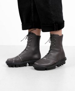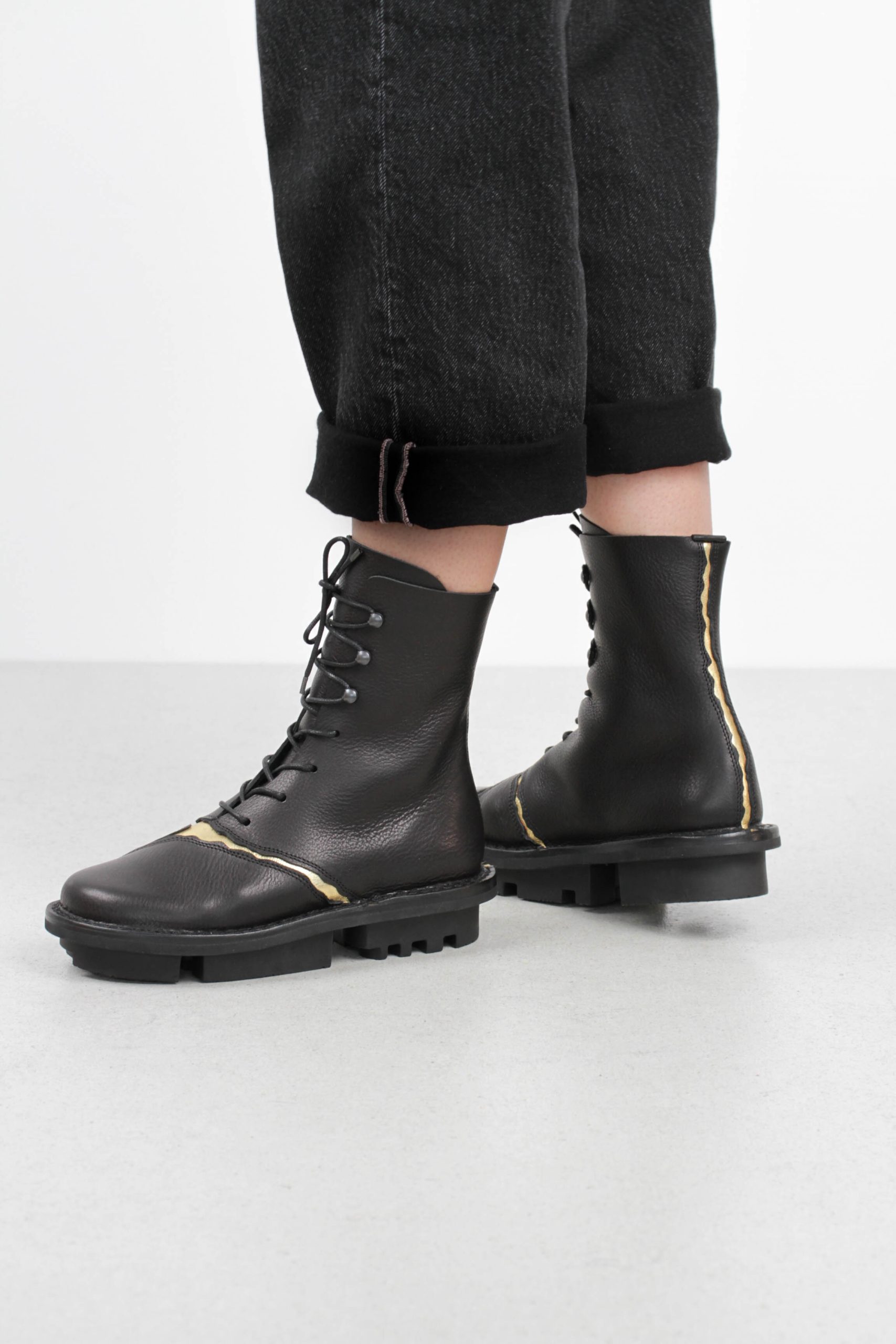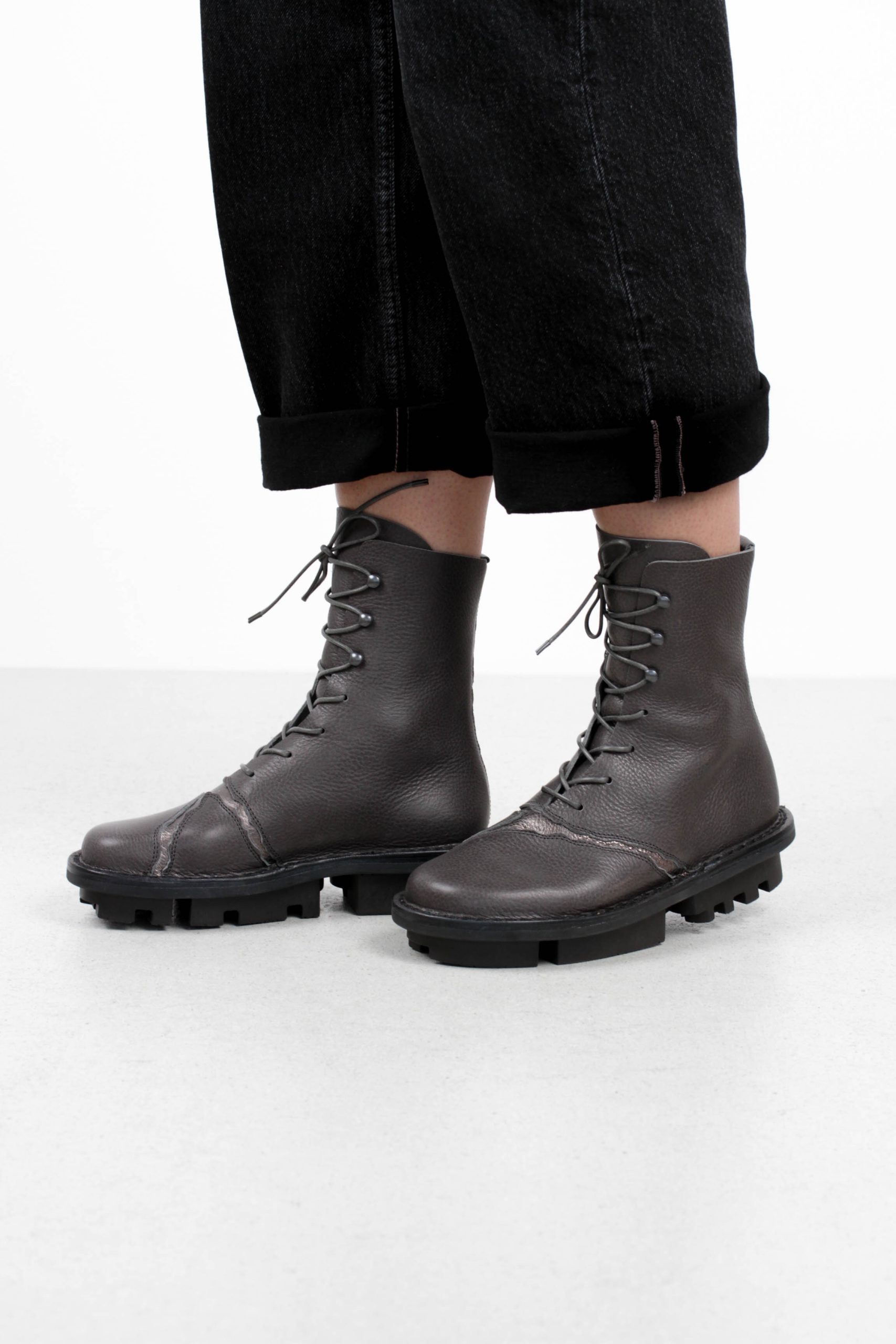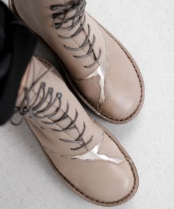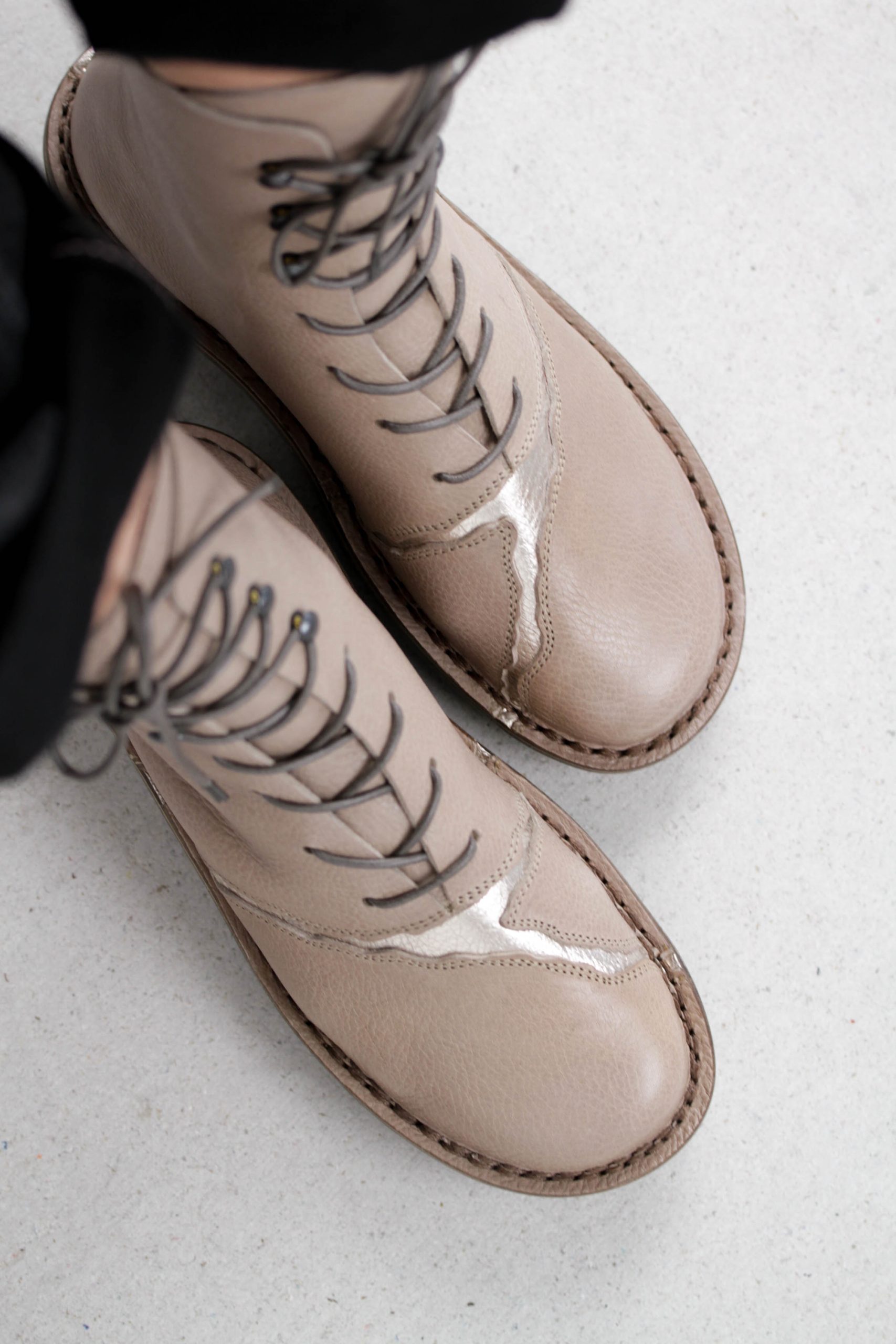 The seams of this mid-high lace-up boot are broken up and underlaid in contrasting colours.