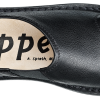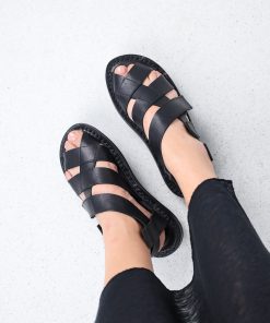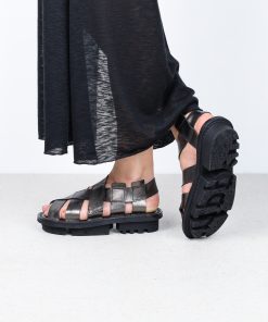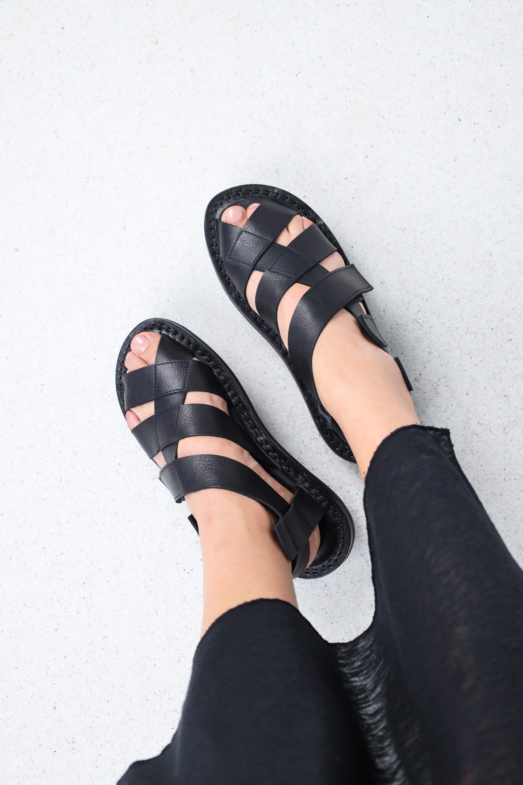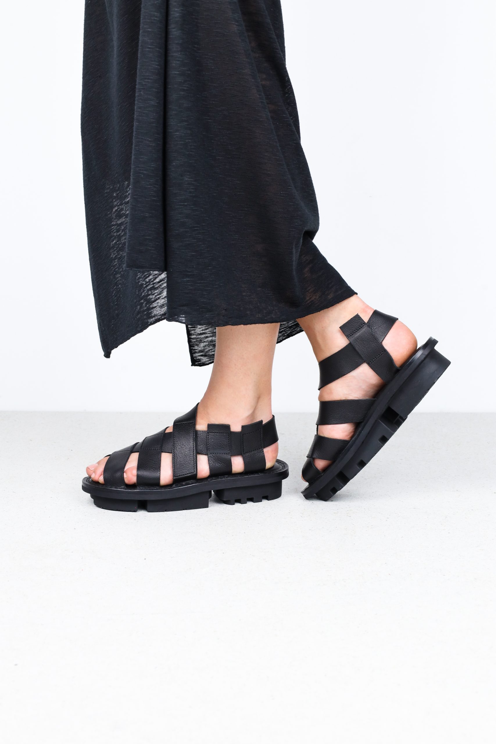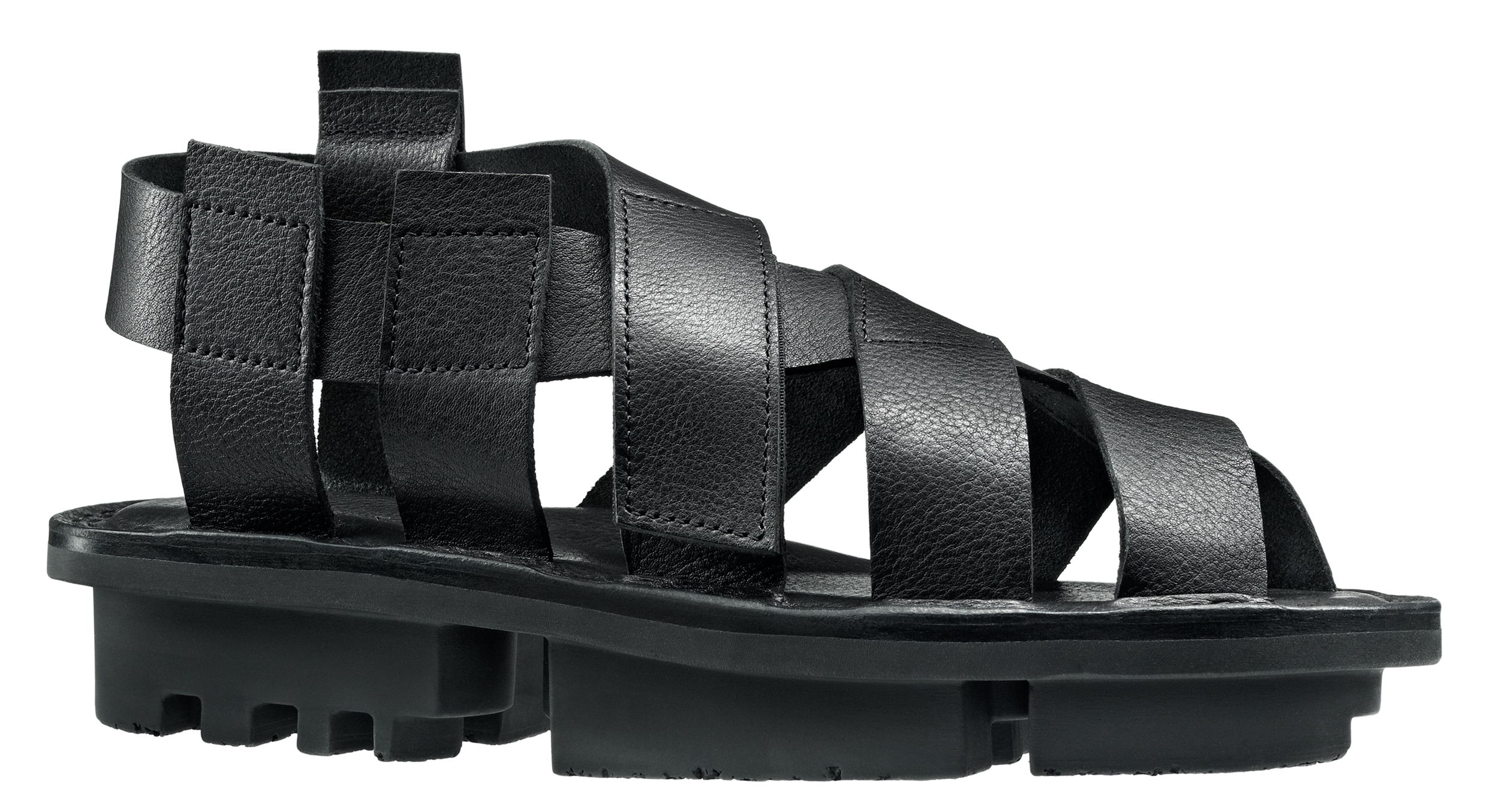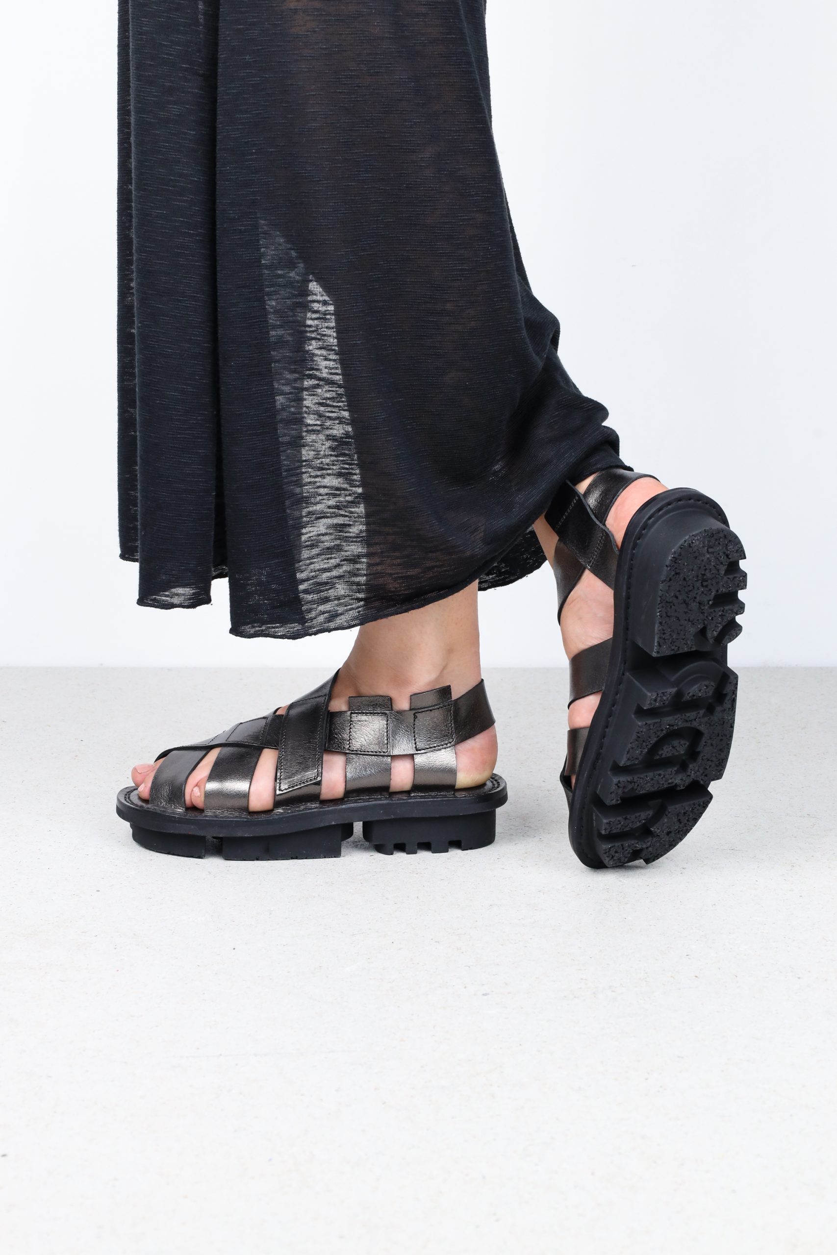 A solid grid of wide straps holds the foot and is fastened over the instep with a closed Velcro fastener.