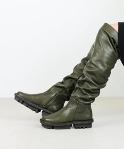 This thigh-high boot is flexible and loose-fitting, with an elastic that creates a ruched effect and provides more space in the leg of the boot.