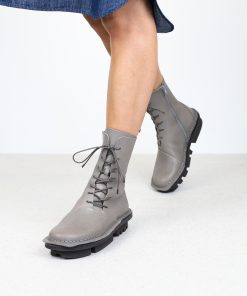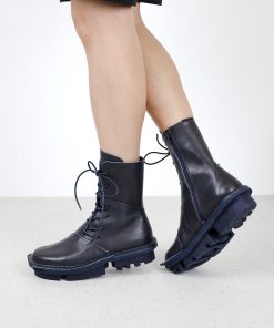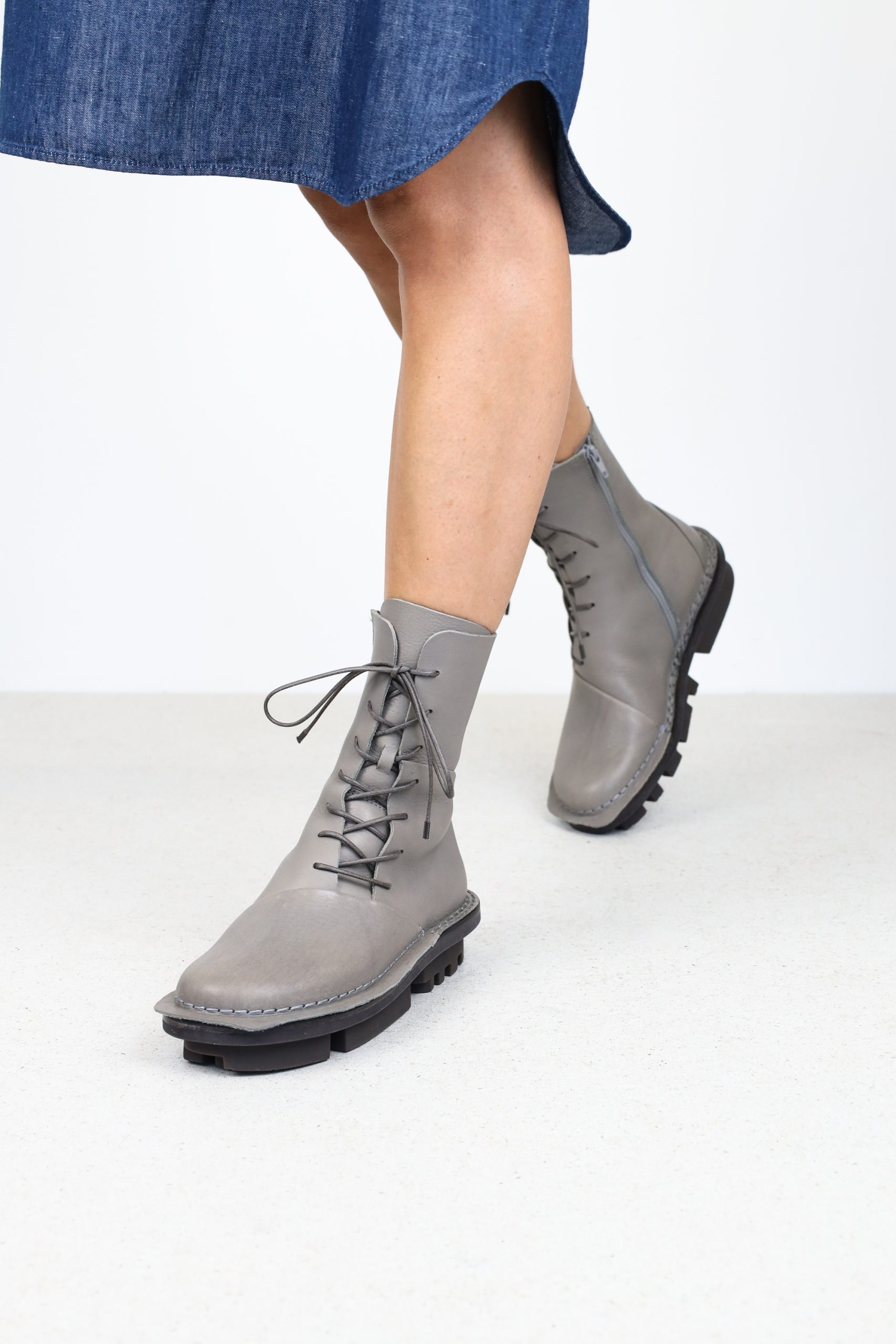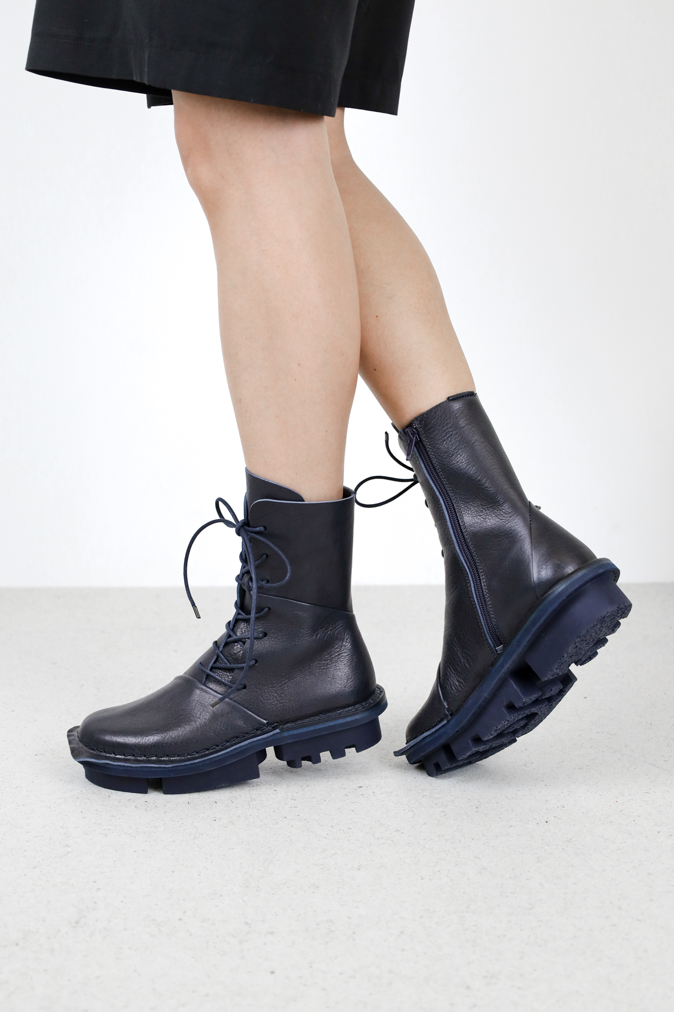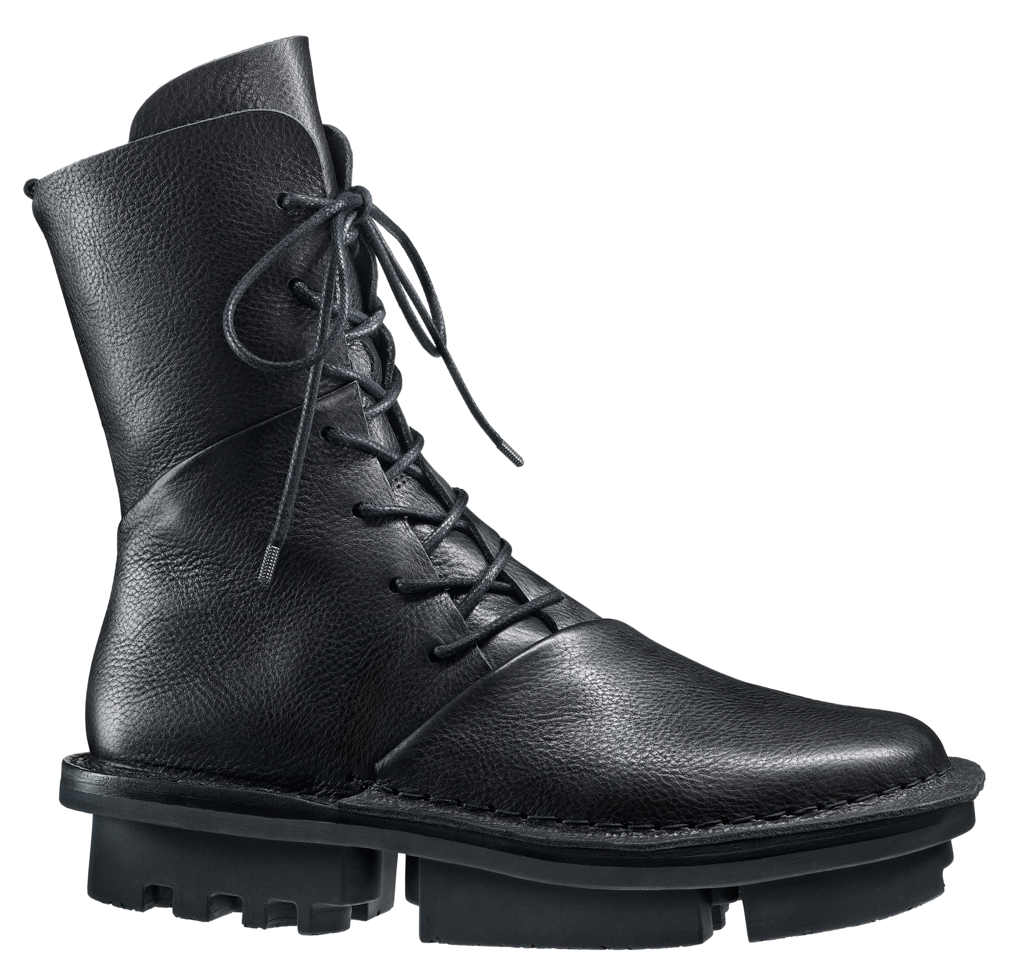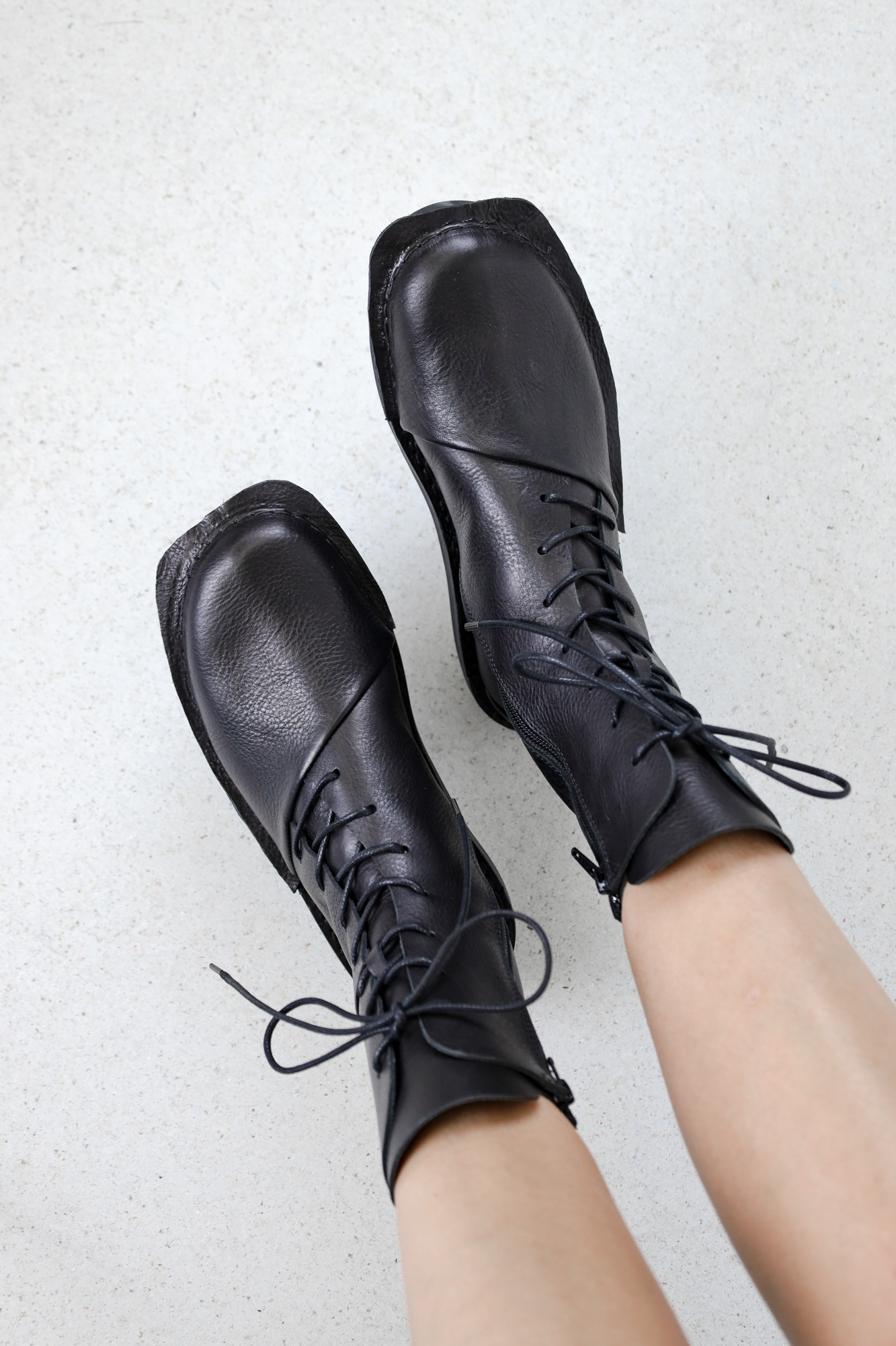 The overlapping leather layer at the front of this boot flows over the natural rounded toe shape and forms a soft square. The asymmetrical lacing can be individually adjusted, while a zipper on the inside makes the boot easy to put on.