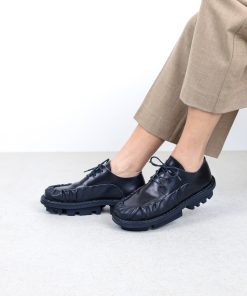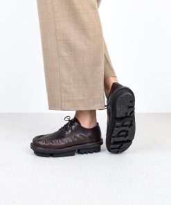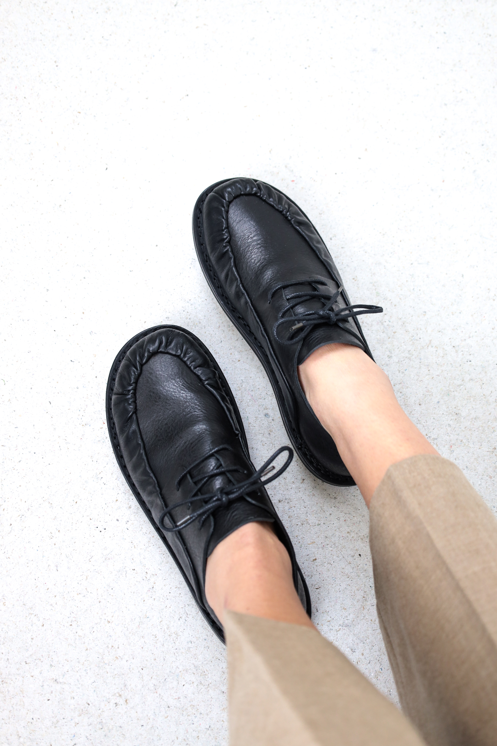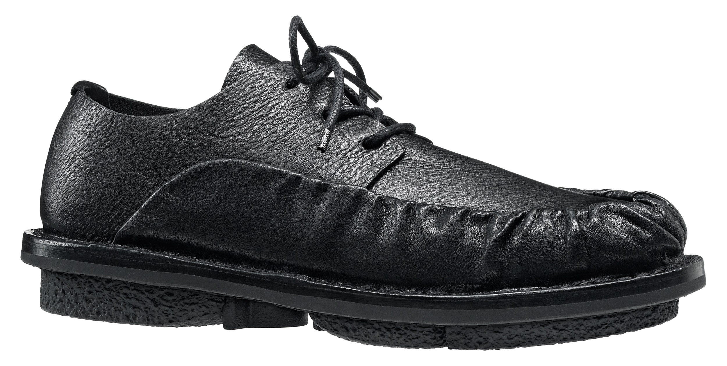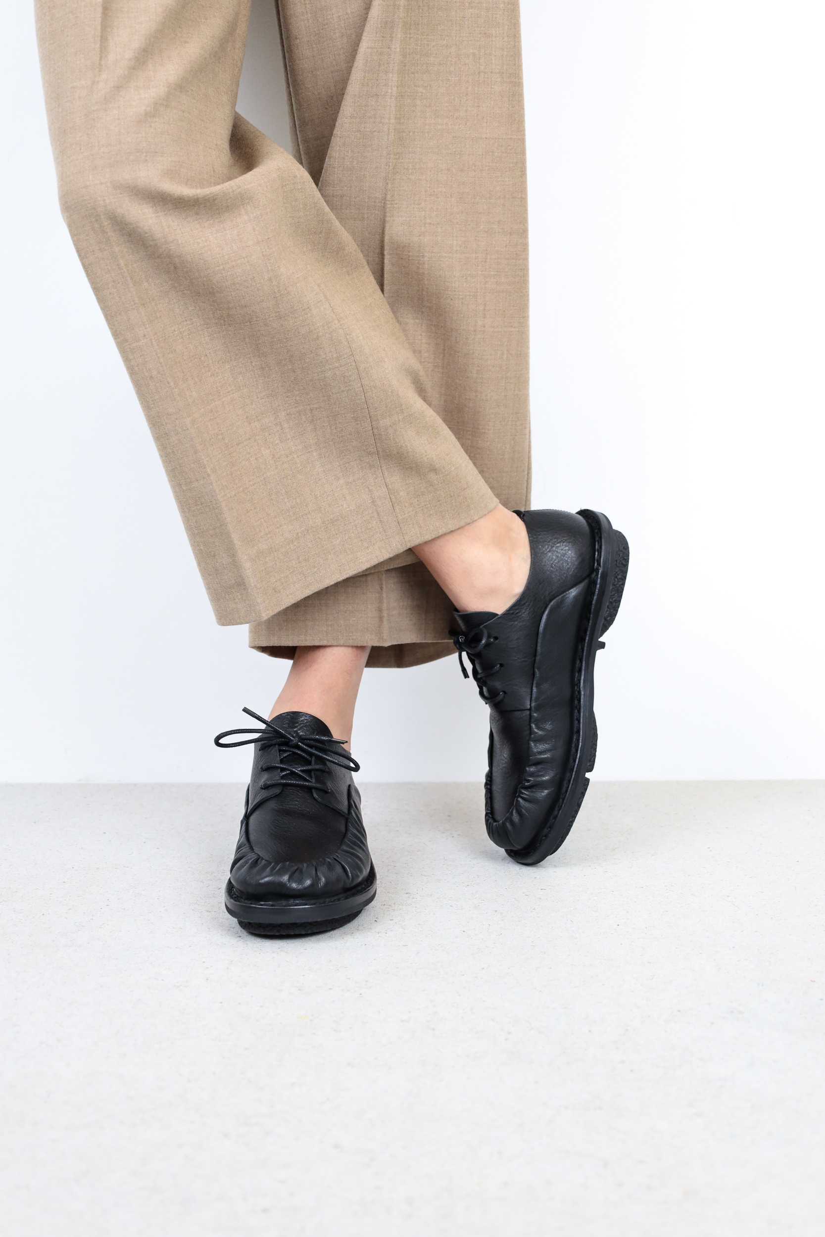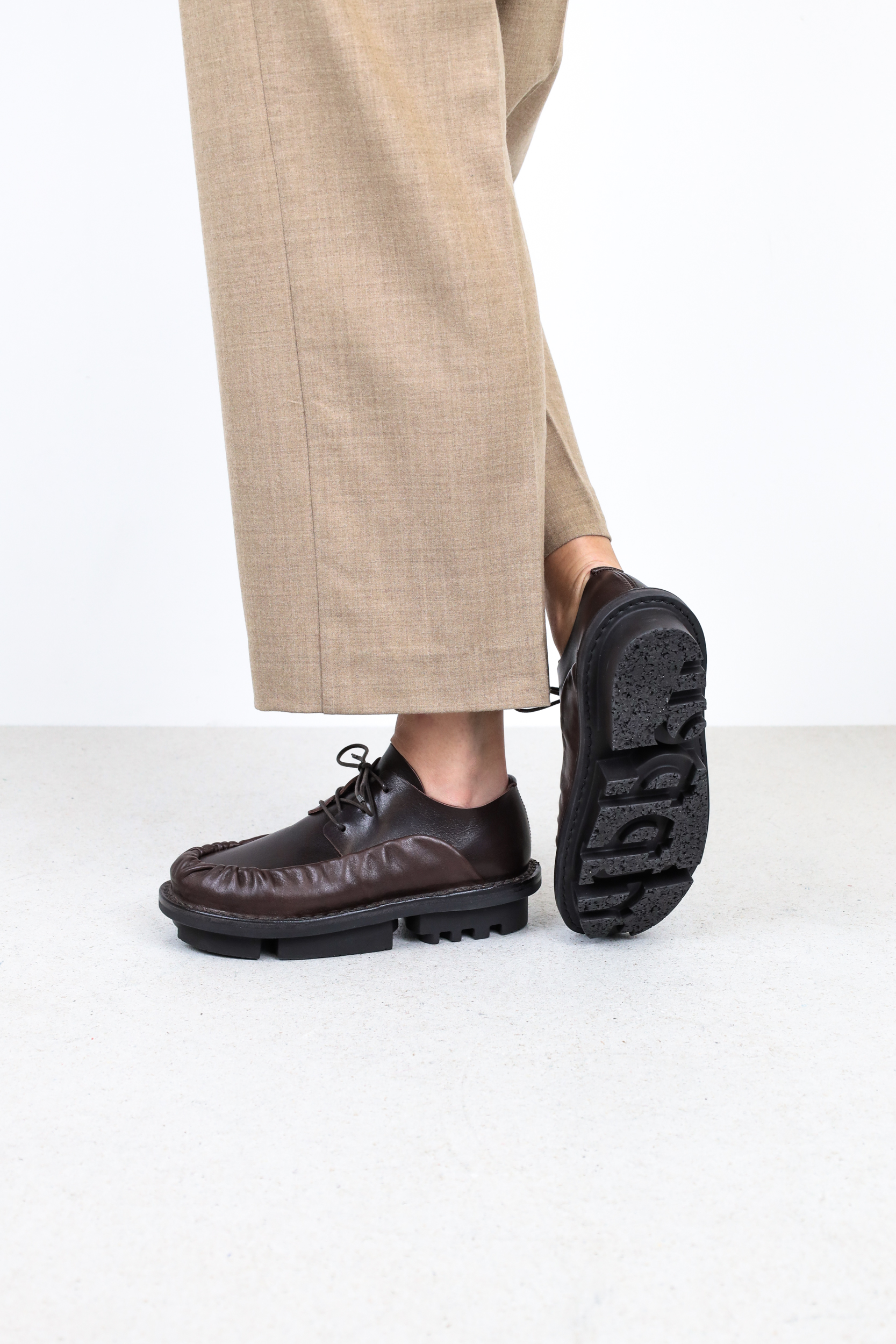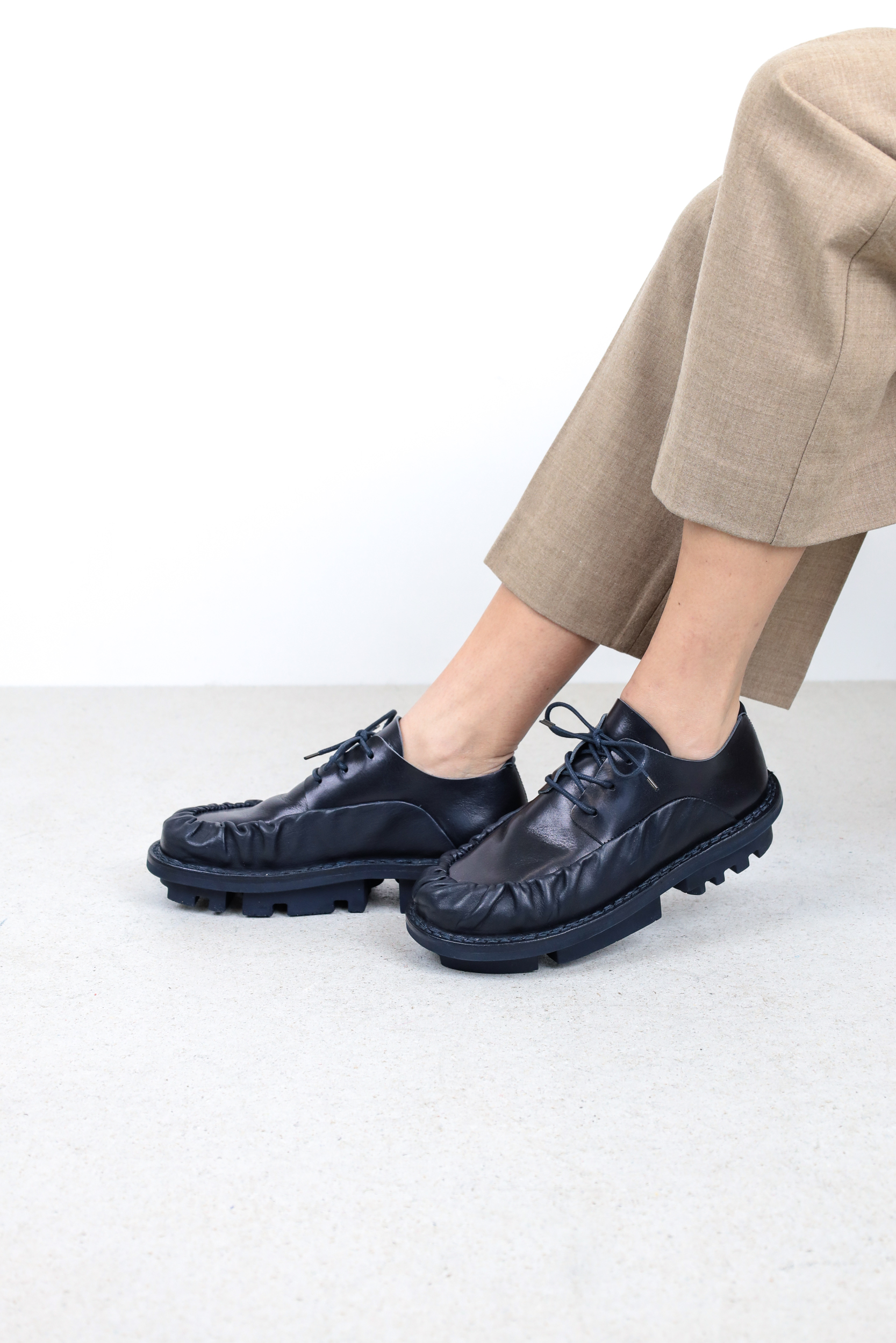 Finely formed pleats are bordered on the edge of the vamp and run out under the derby lacing.