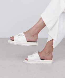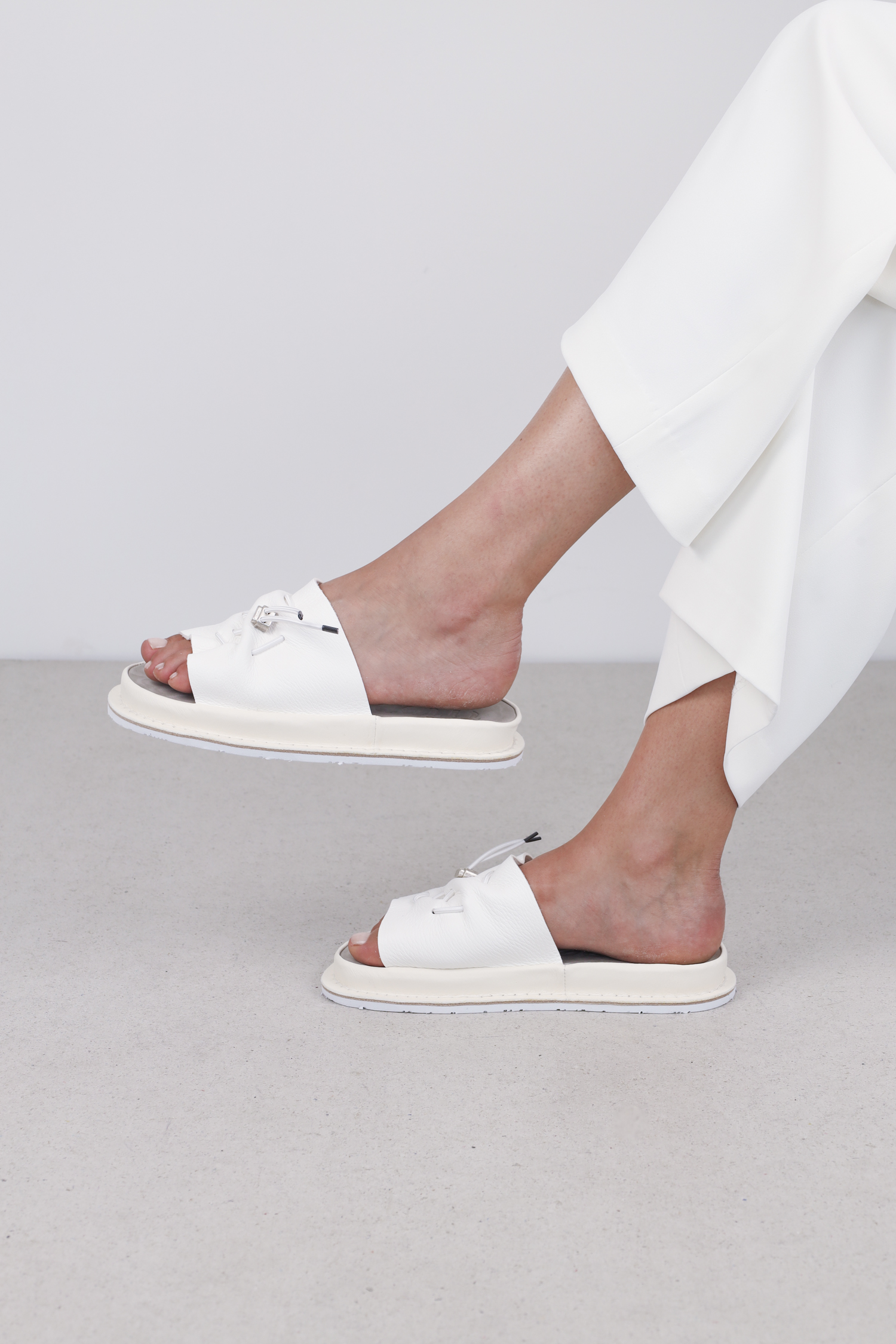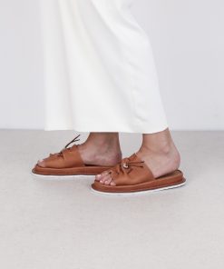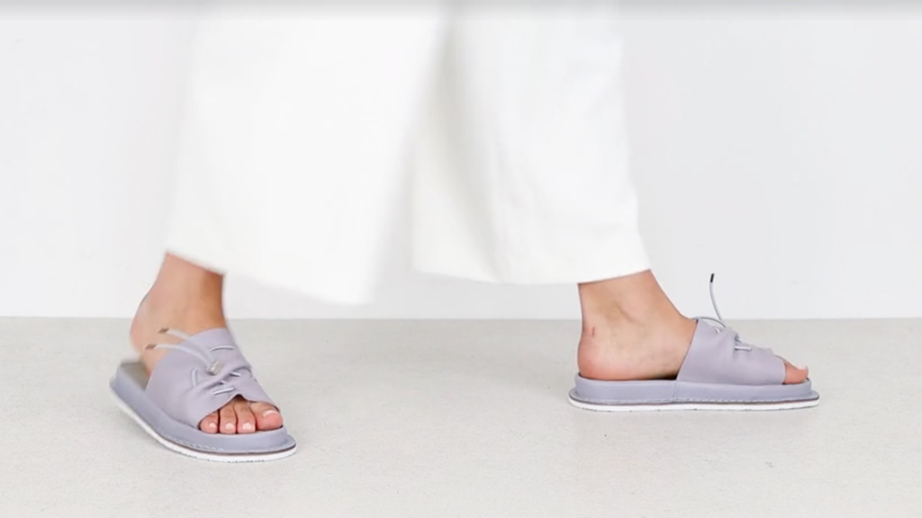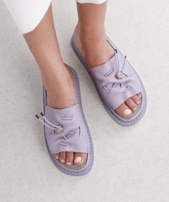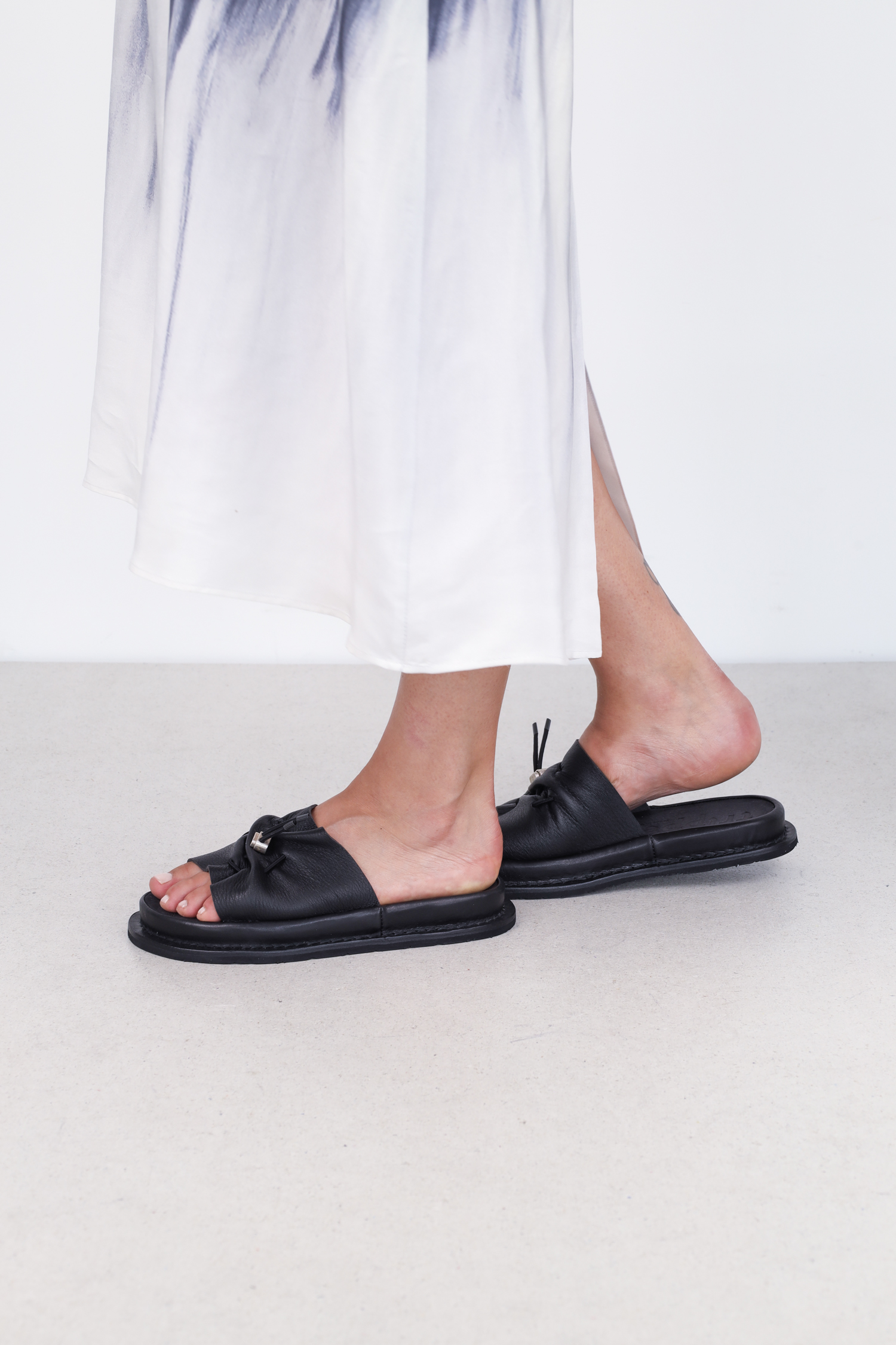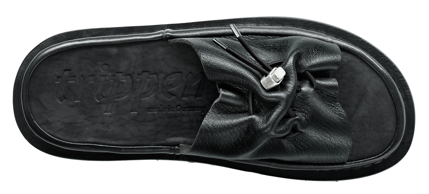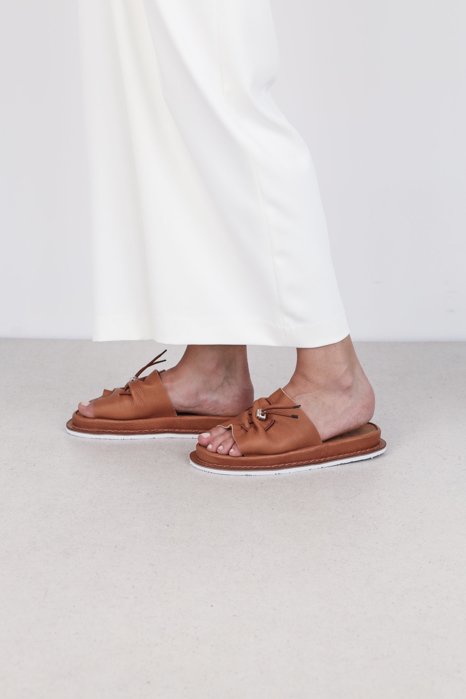 Comfortable slip-on sandal with deer leather gathered on the top into a spiral shape by an adjustable and elastic lace.