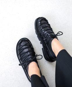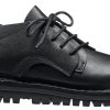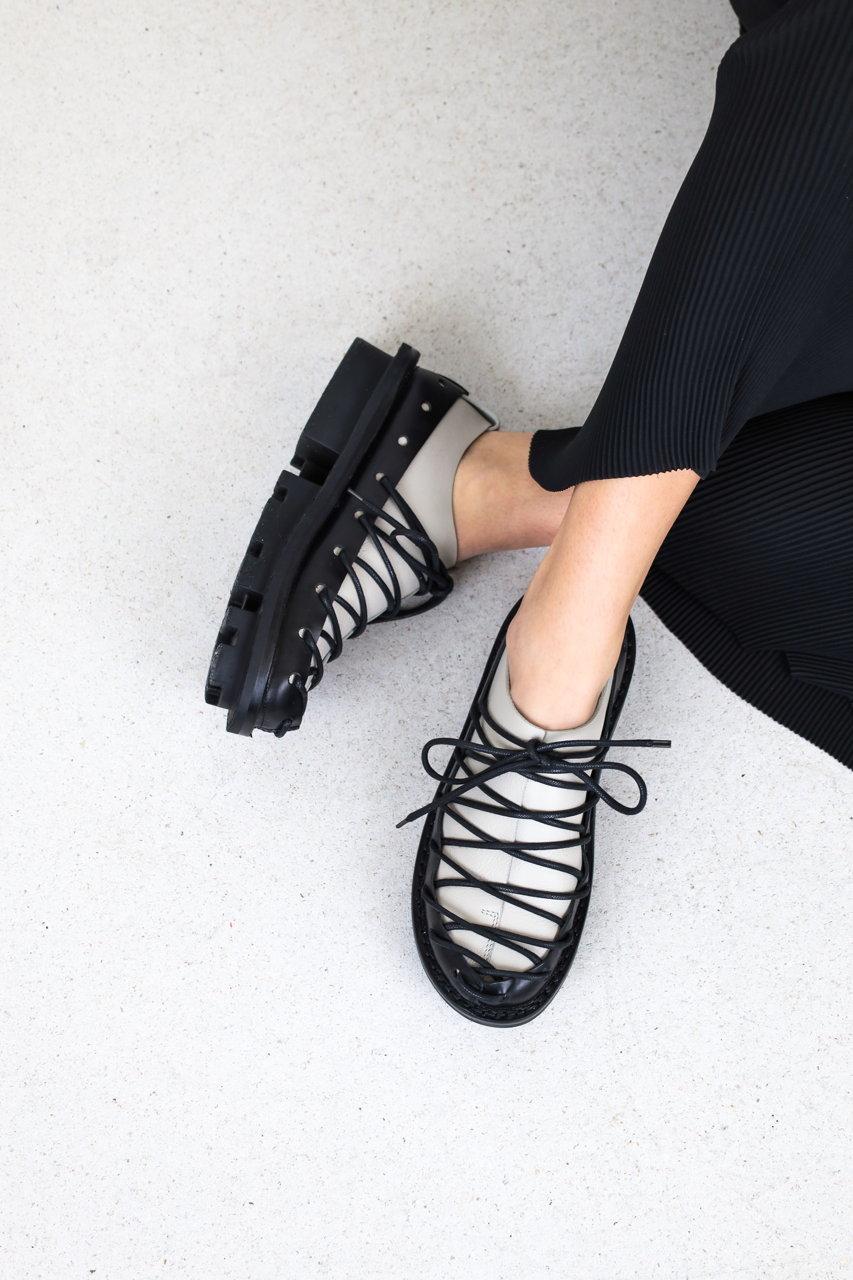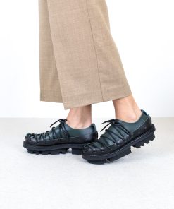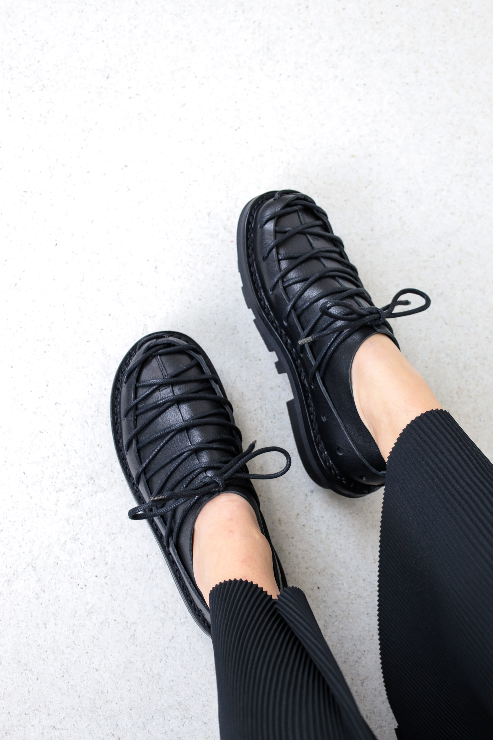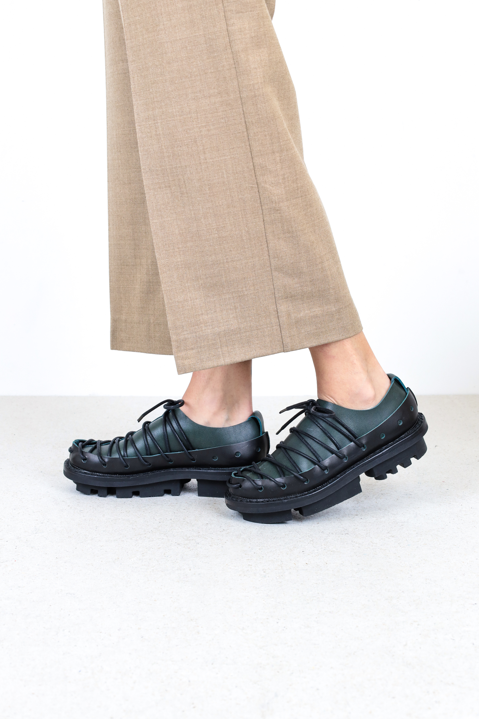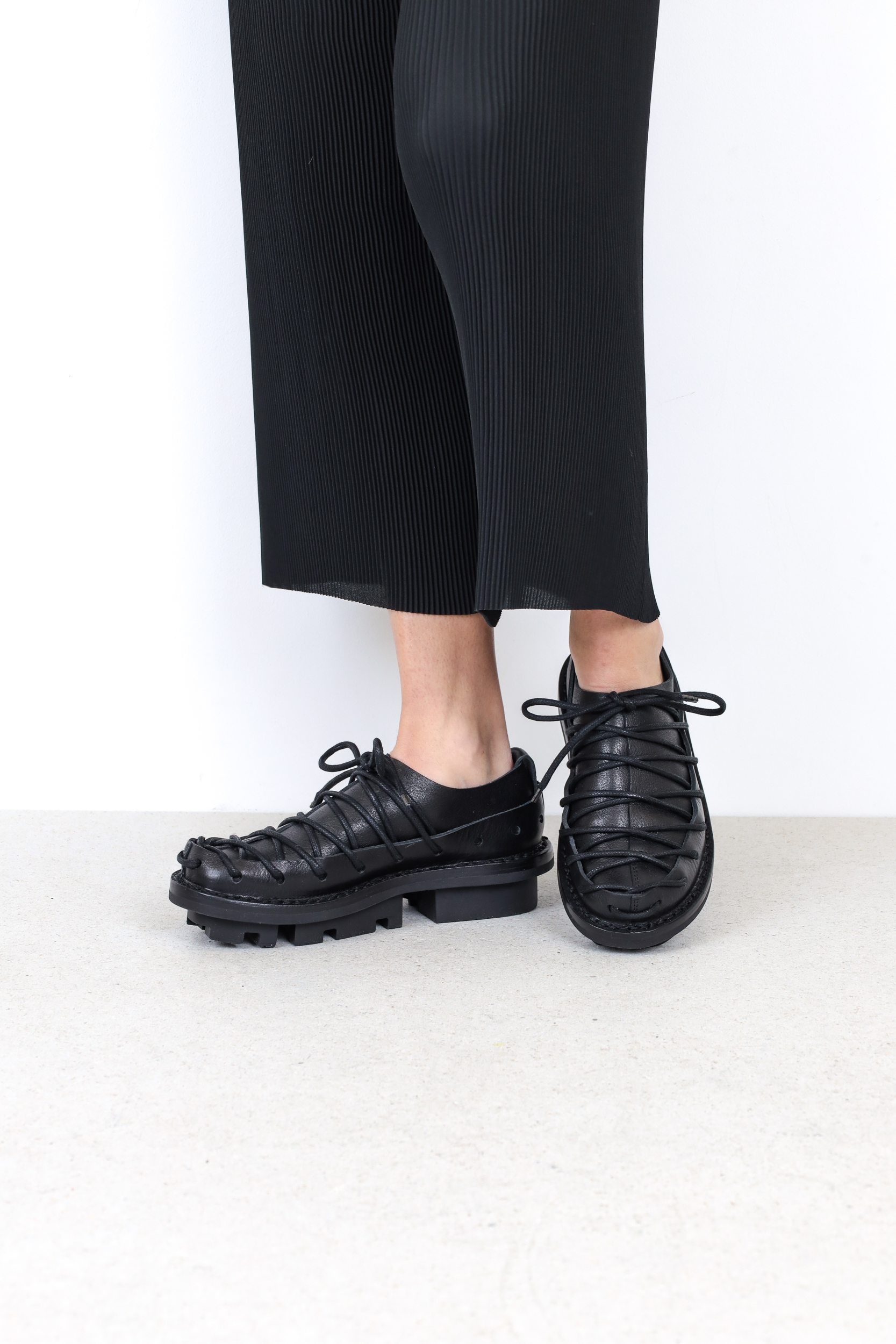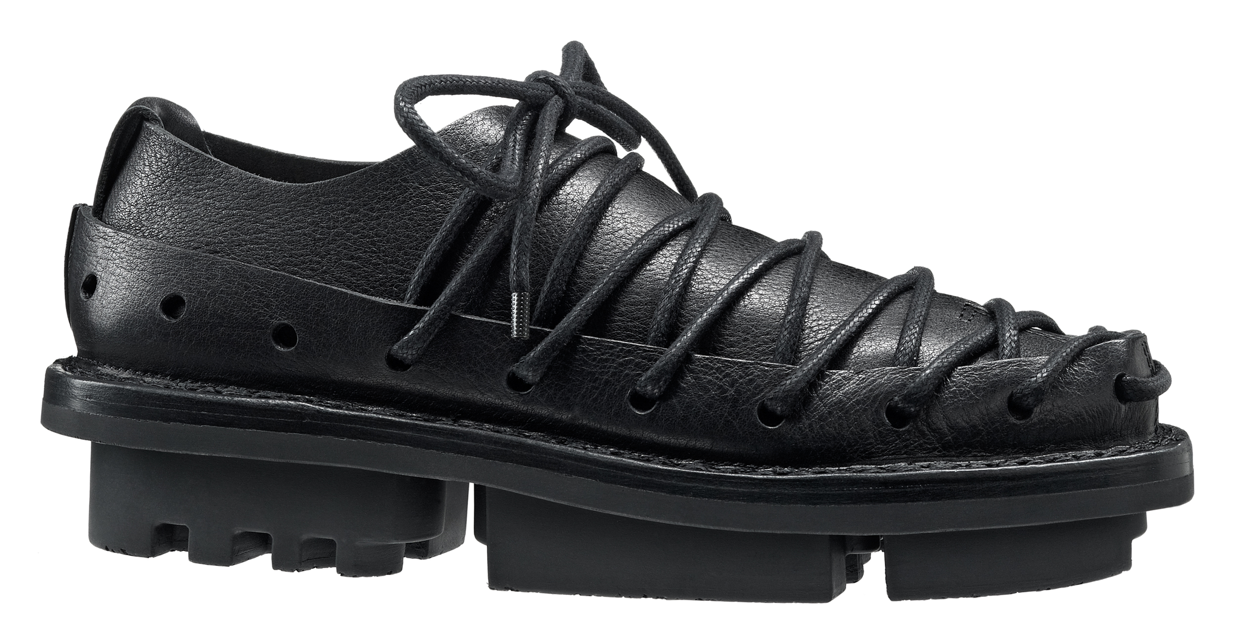 A circumferential perforated band made of sturdy leather holds the overlapping leather over the forefoot together in a tight lacing sequence.