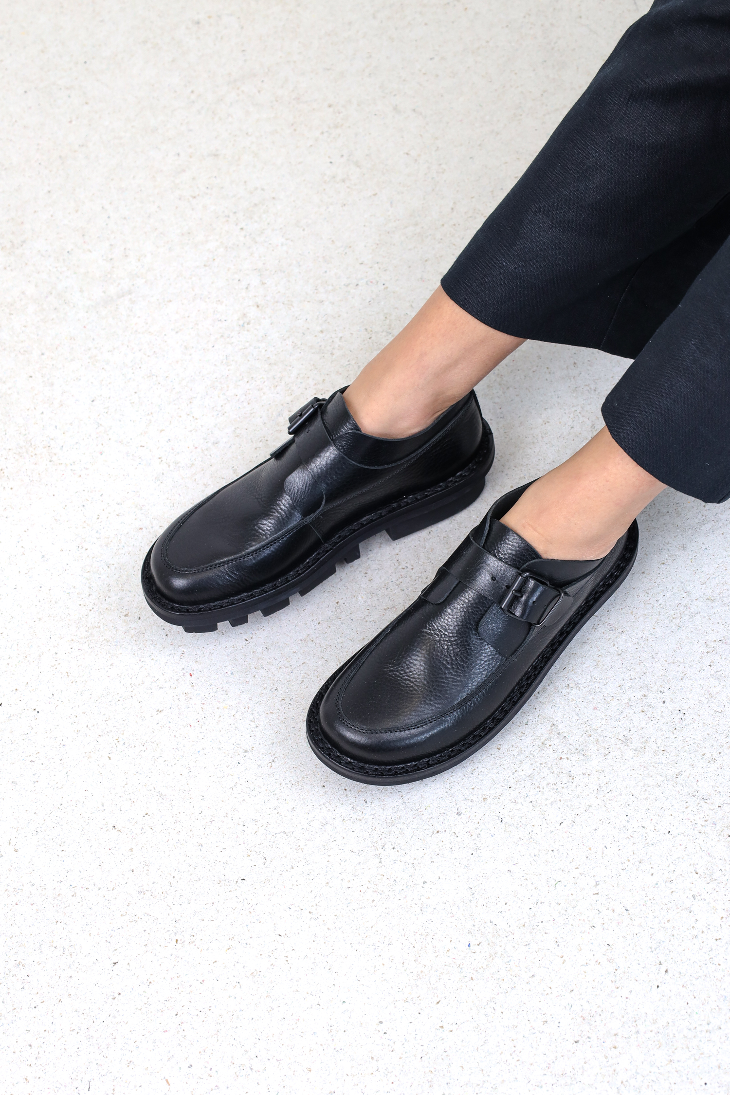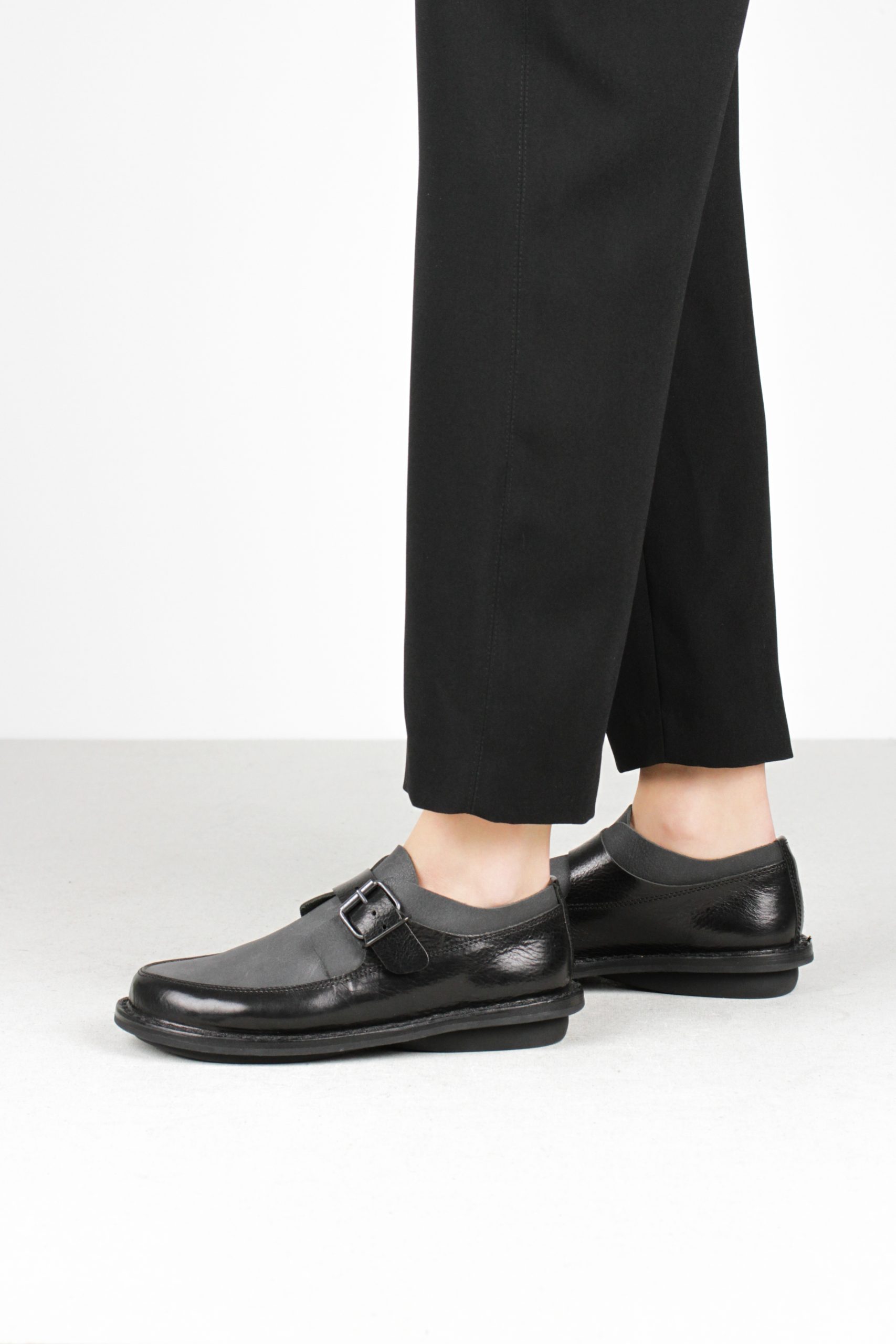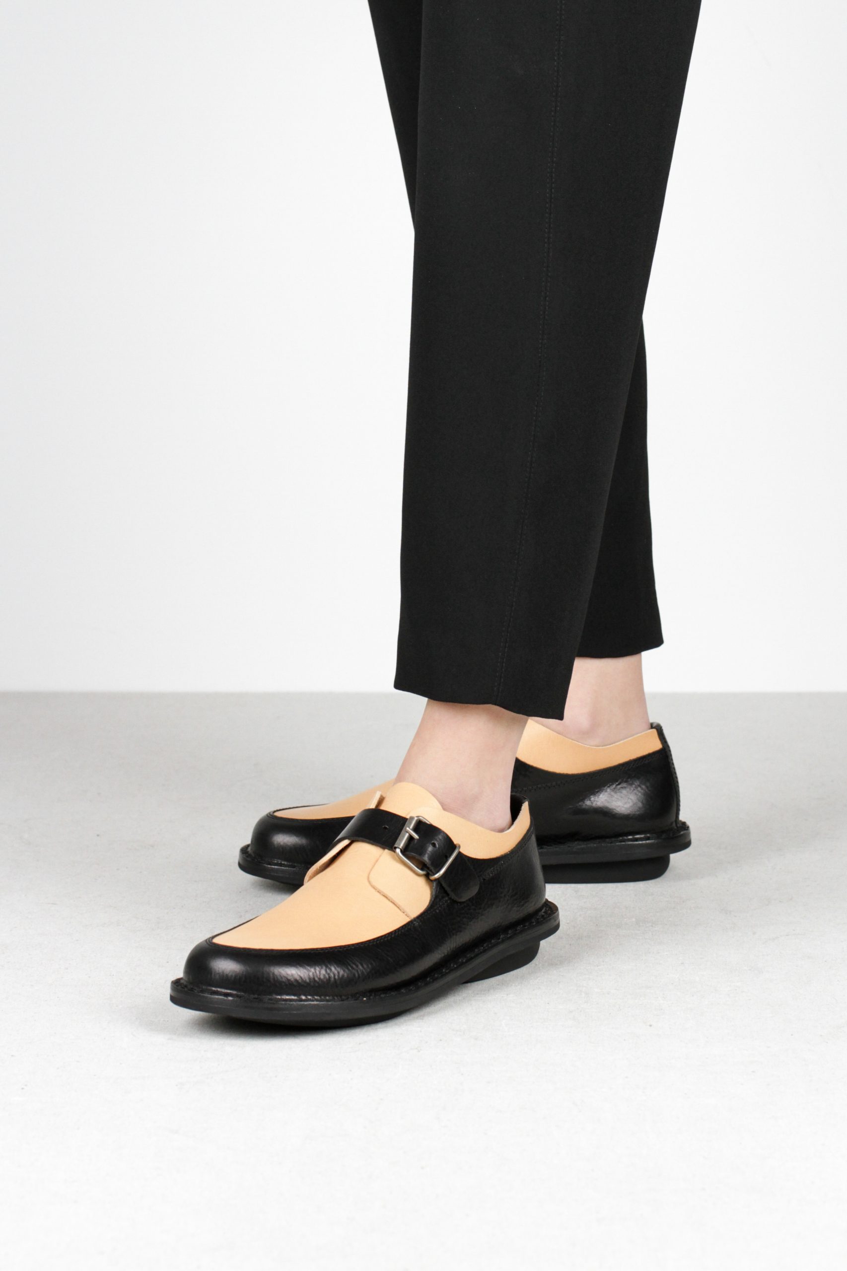 Classic unisex low-cut shoe with elegant surface and a simple buckle over the instep. Available in a range of colour combinations.