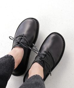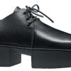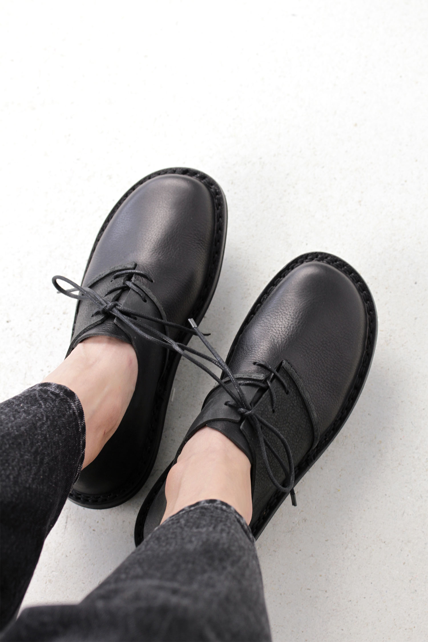 This lace-up low-cut shoe, featuring three different leathers, is composed of outwardly worked raw seams.