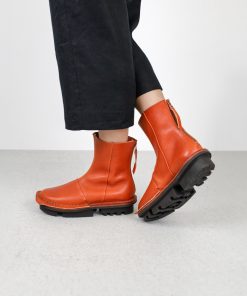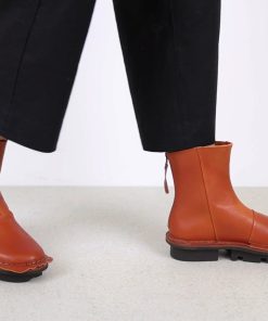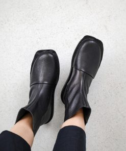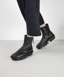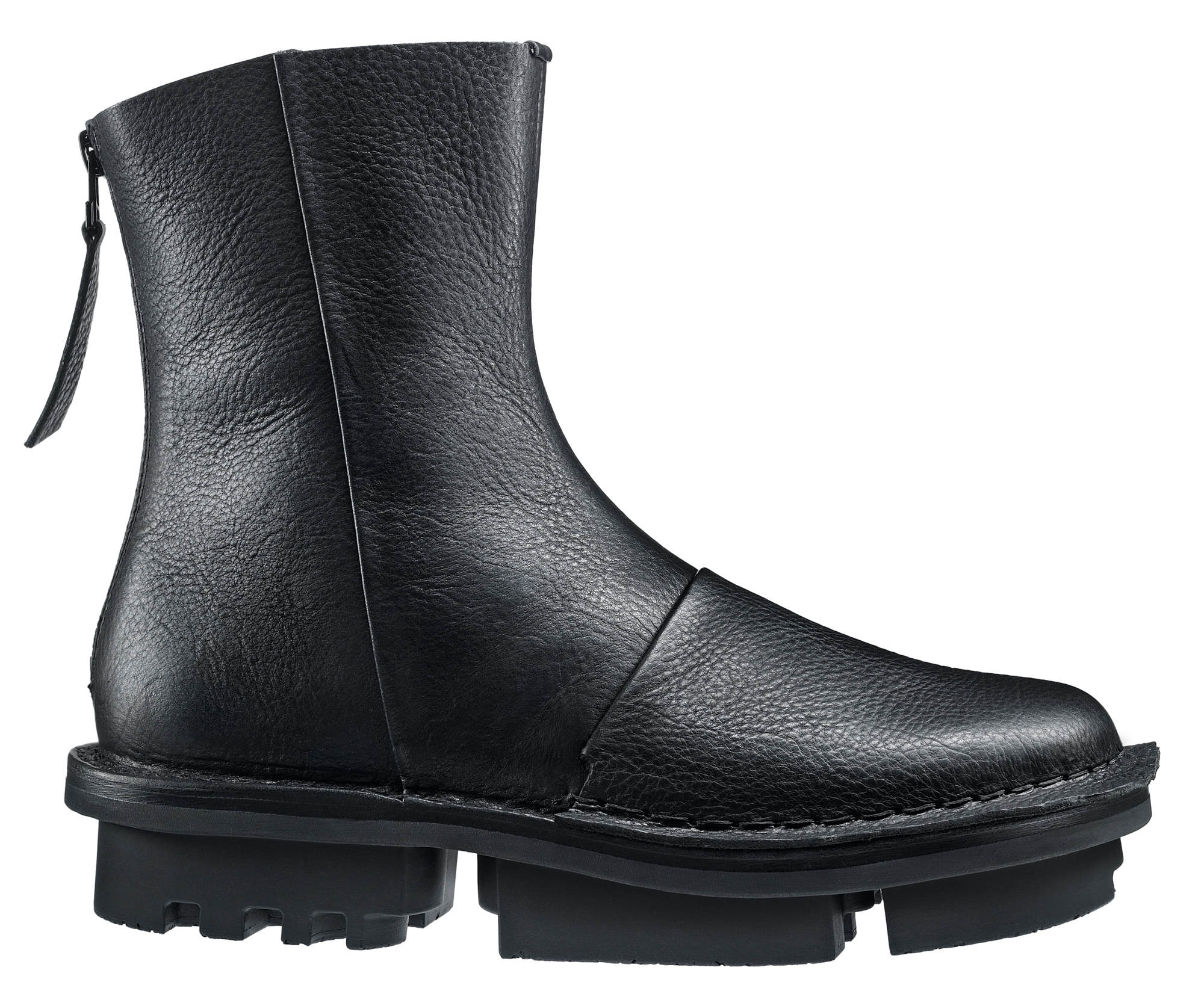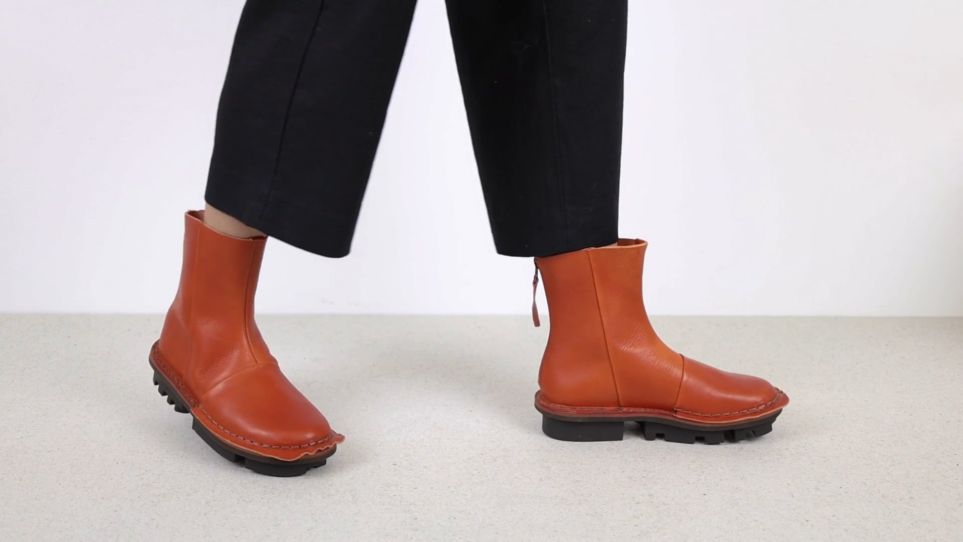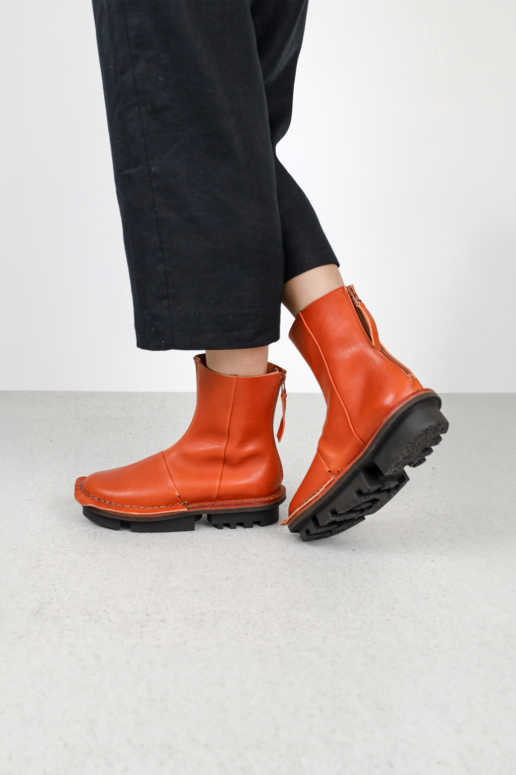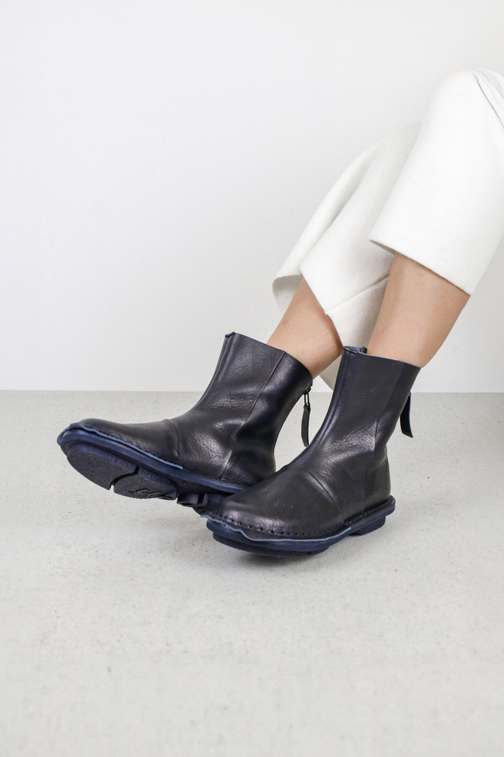 The overlapping leather layer at the front of this boot flows over the natural rounded toe shape and forms a soft square. A zipper at the centre back closes the simple shaft.