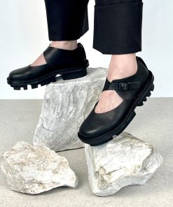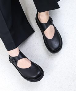 Summery low-cut shoe with lateral buckle and a combination of soft leather in front and firmer leather around the heel.