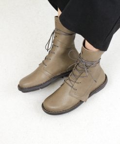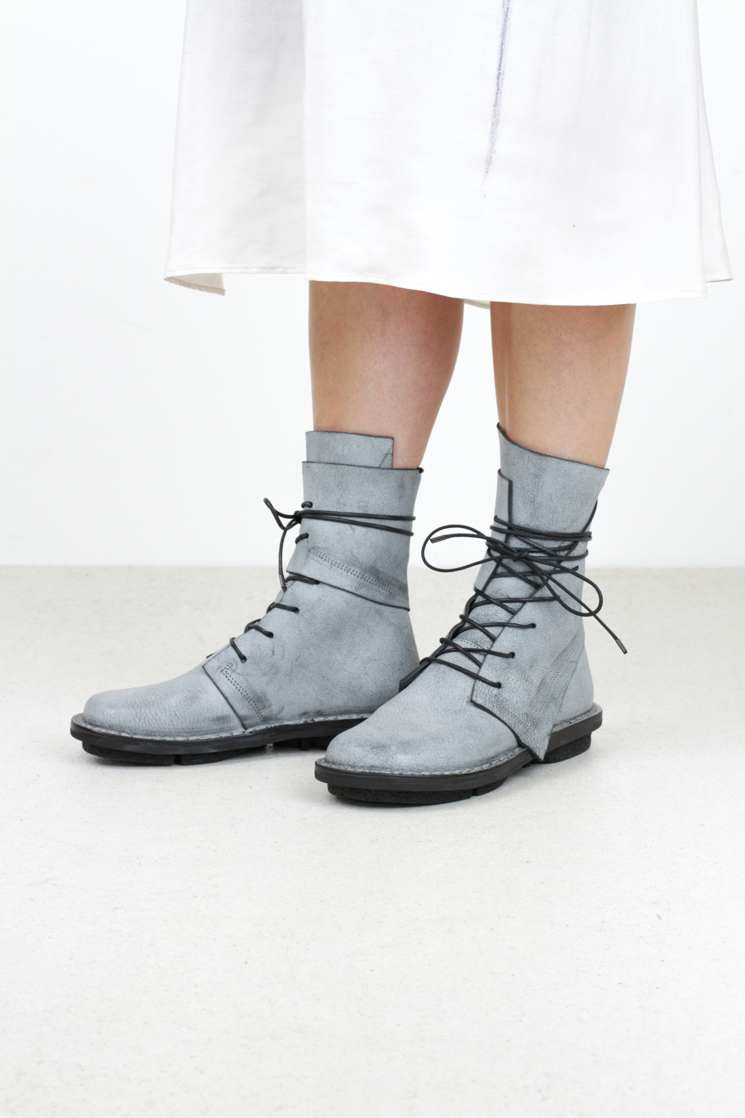 This asymmetrical, lace-up ankle boot features rectangular layering and top-stitching to evoke a slightly dislocated visual-effect.