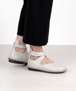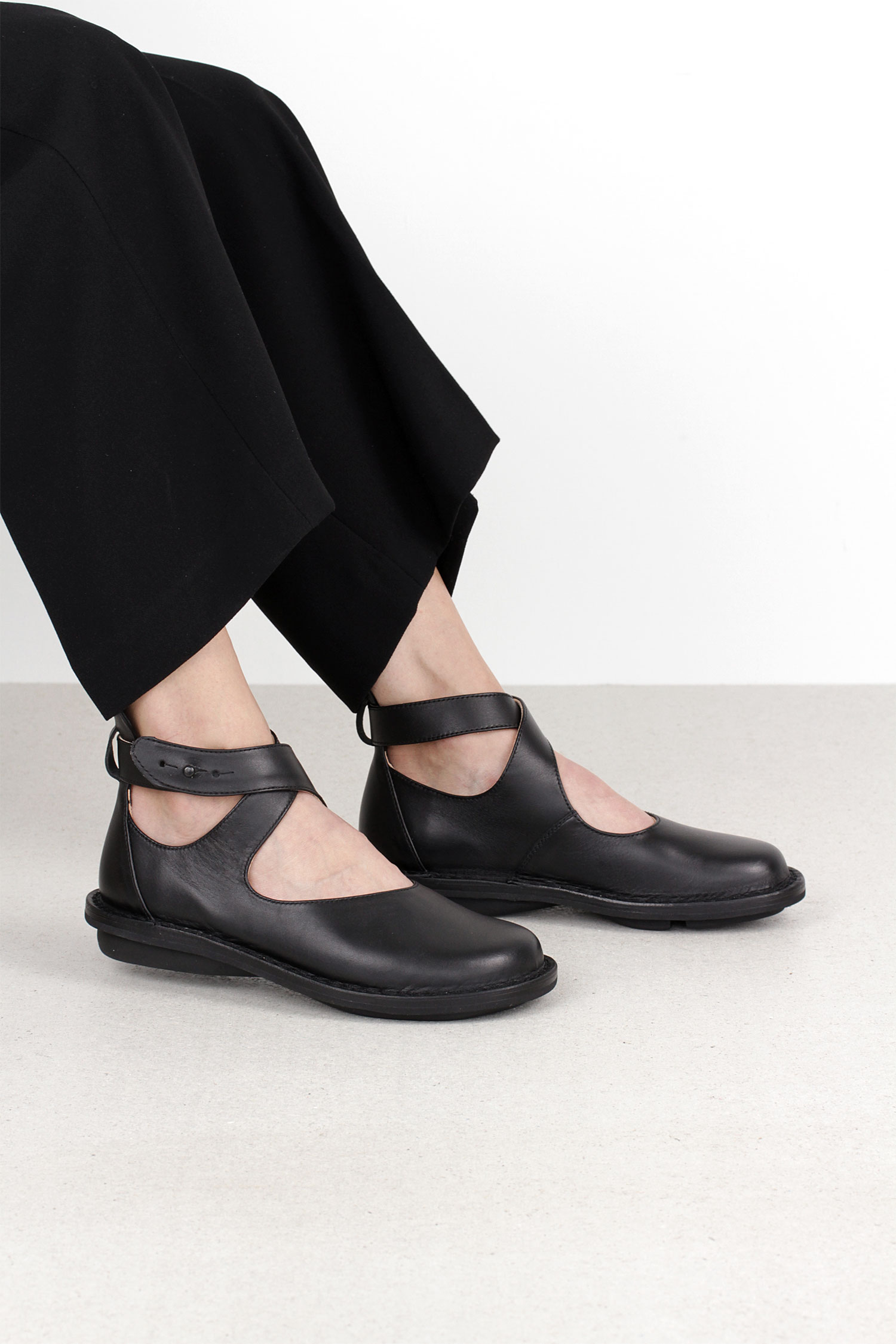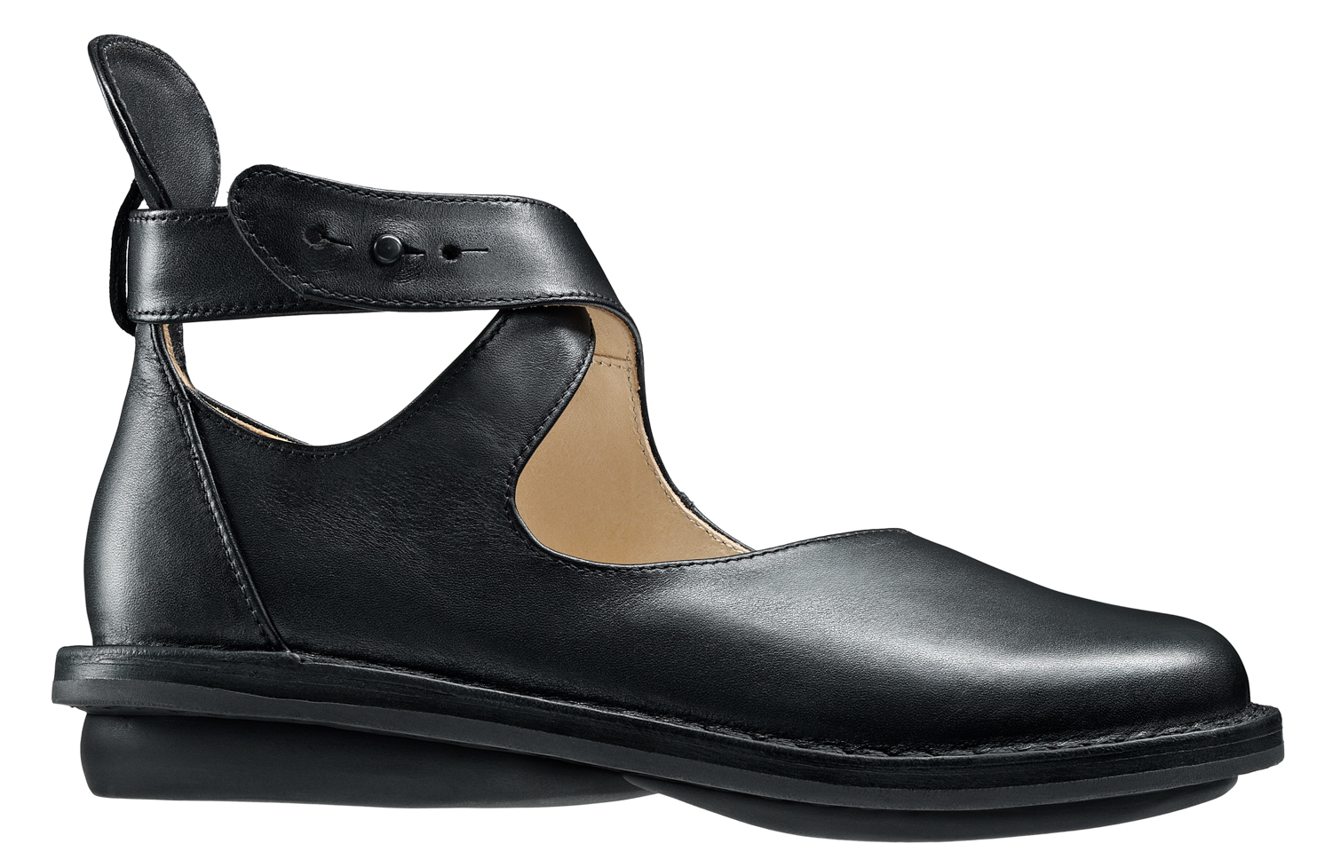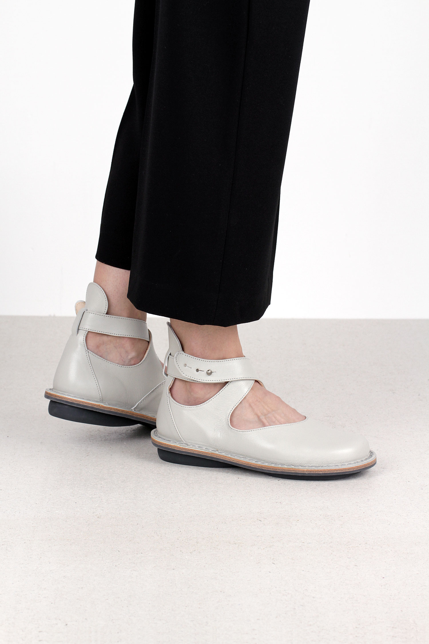 Classic half-open shoe with crossover on instep and cartridge button closure.